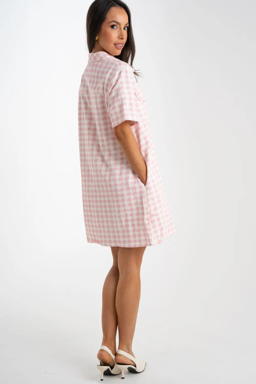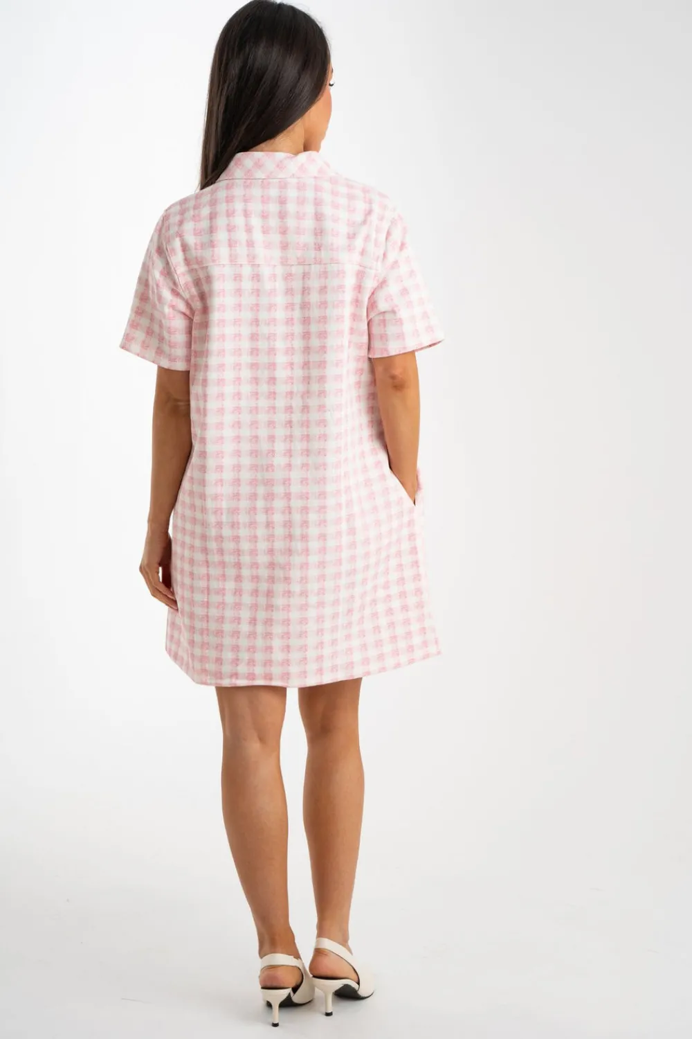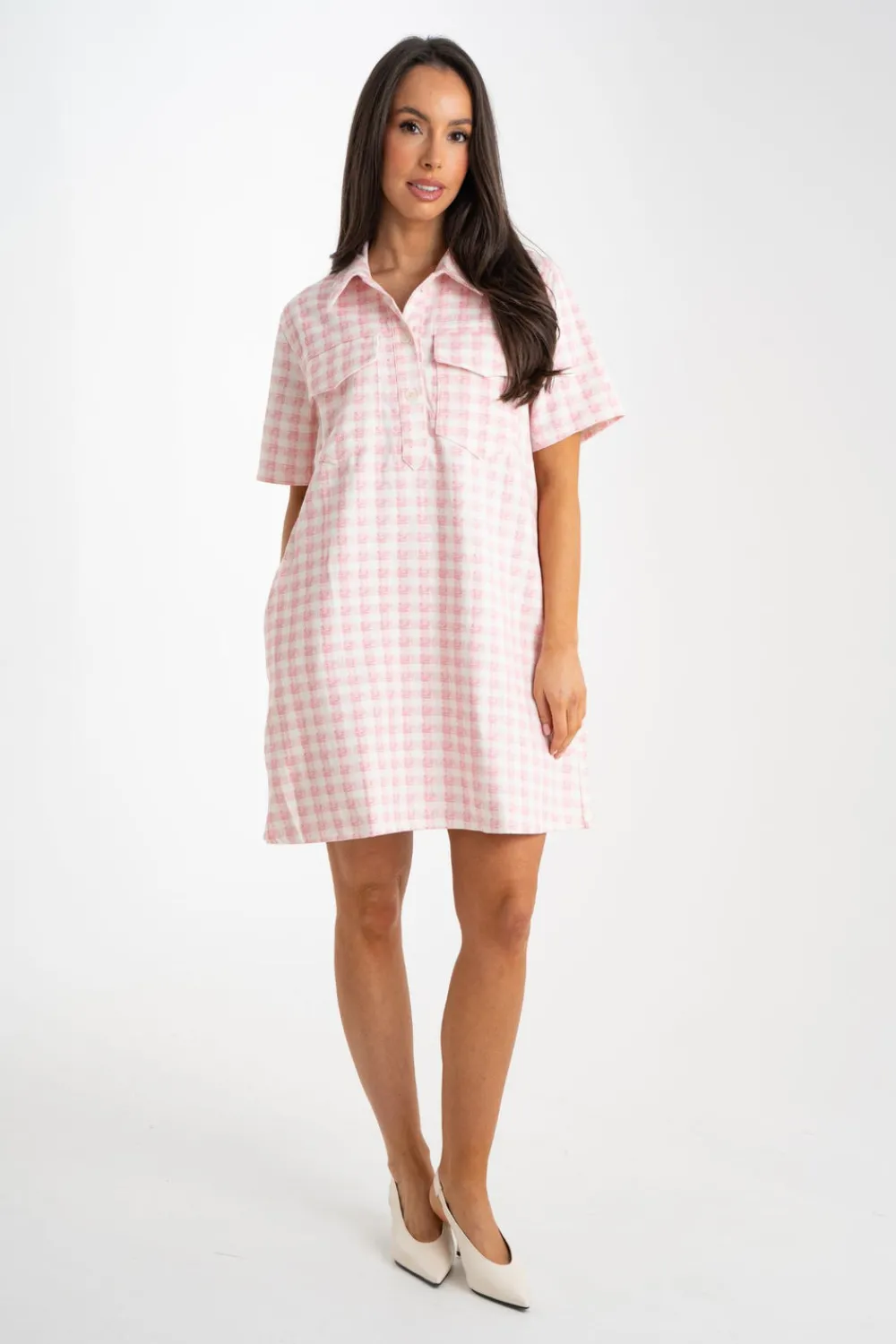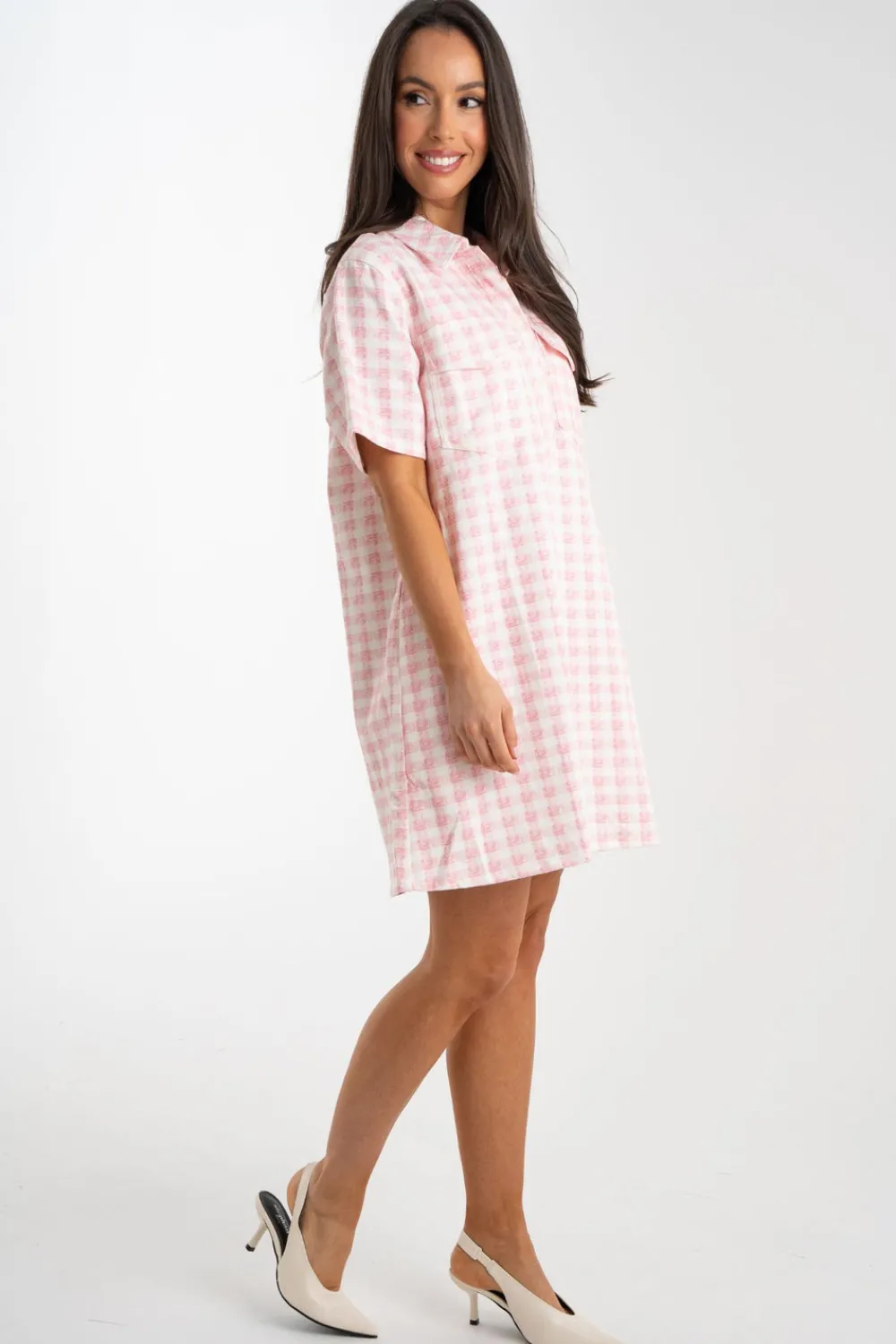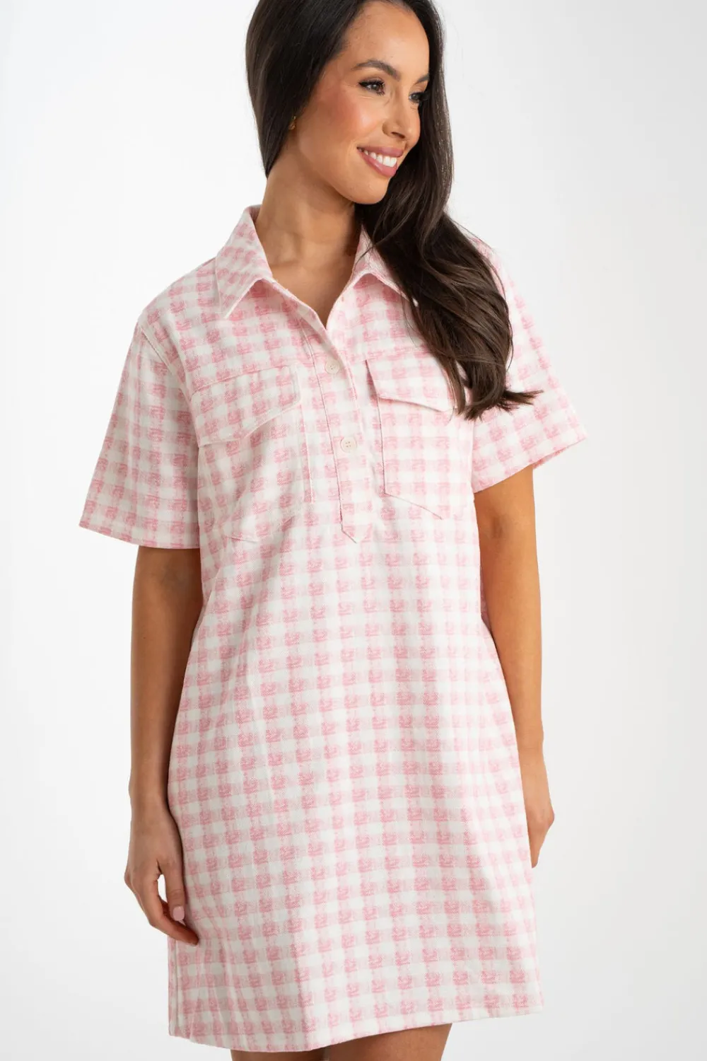 The Daisy Gingham T-Shirt Dress in Pink features a classic collar and button front for a polished look. With short sleeves and a playful pink gingham print, this dress is perfect for any occasion. Its short length adds a touch of modernity to this timeless design.