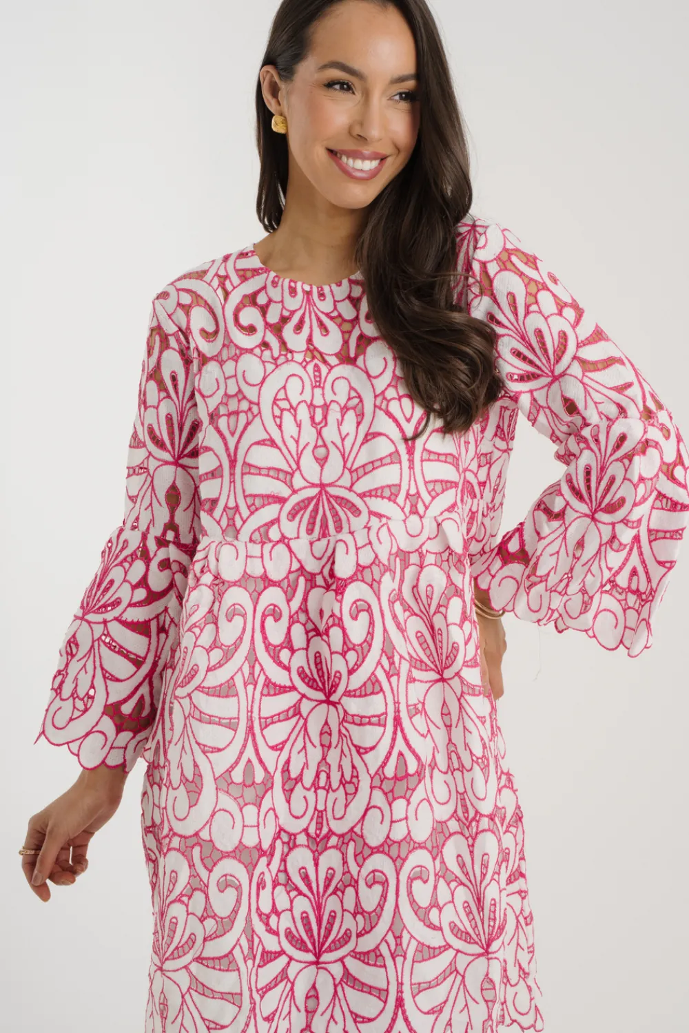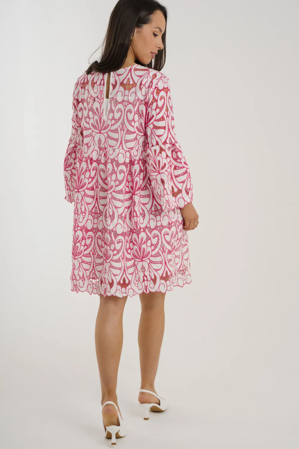 Expertly crafted with a round neck and long, bell sleeves, the Elsa Embroidered Dress is a must-have for any wardrobe. Its delicate pink embroidery adds a touch of feminine elegance, while the keyhole back adds a modern twist. This dress is fully lined for comfort and sophistication.