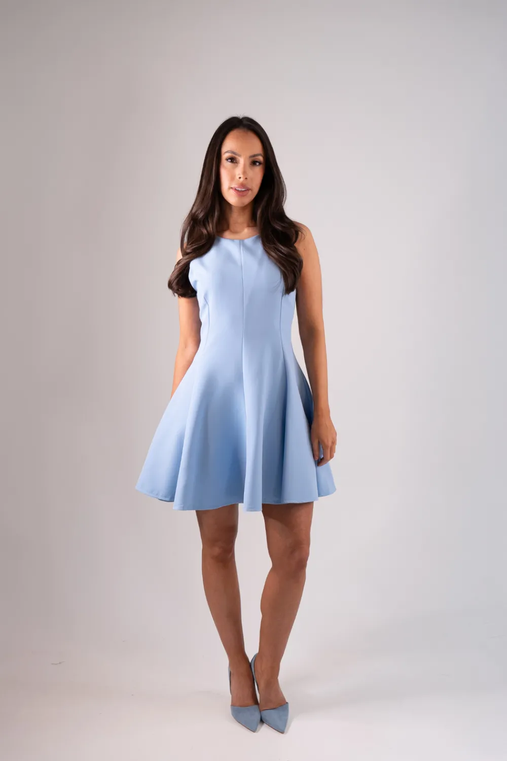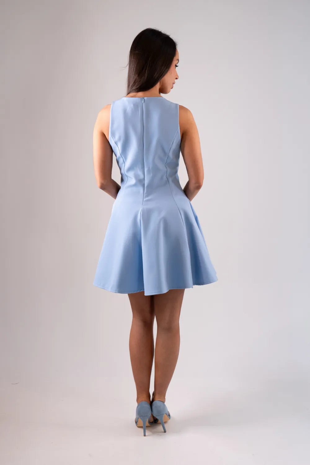 The Erica Seamed Dress in Light Blue is designed with a round neck and sleeveless style, allowing for comfort and flexibility. The fuller skirt provides a flattering silhouette while the seam details add a touch of sophistication. Made with a sky blue fabric, this dress is perfect for any occasion.