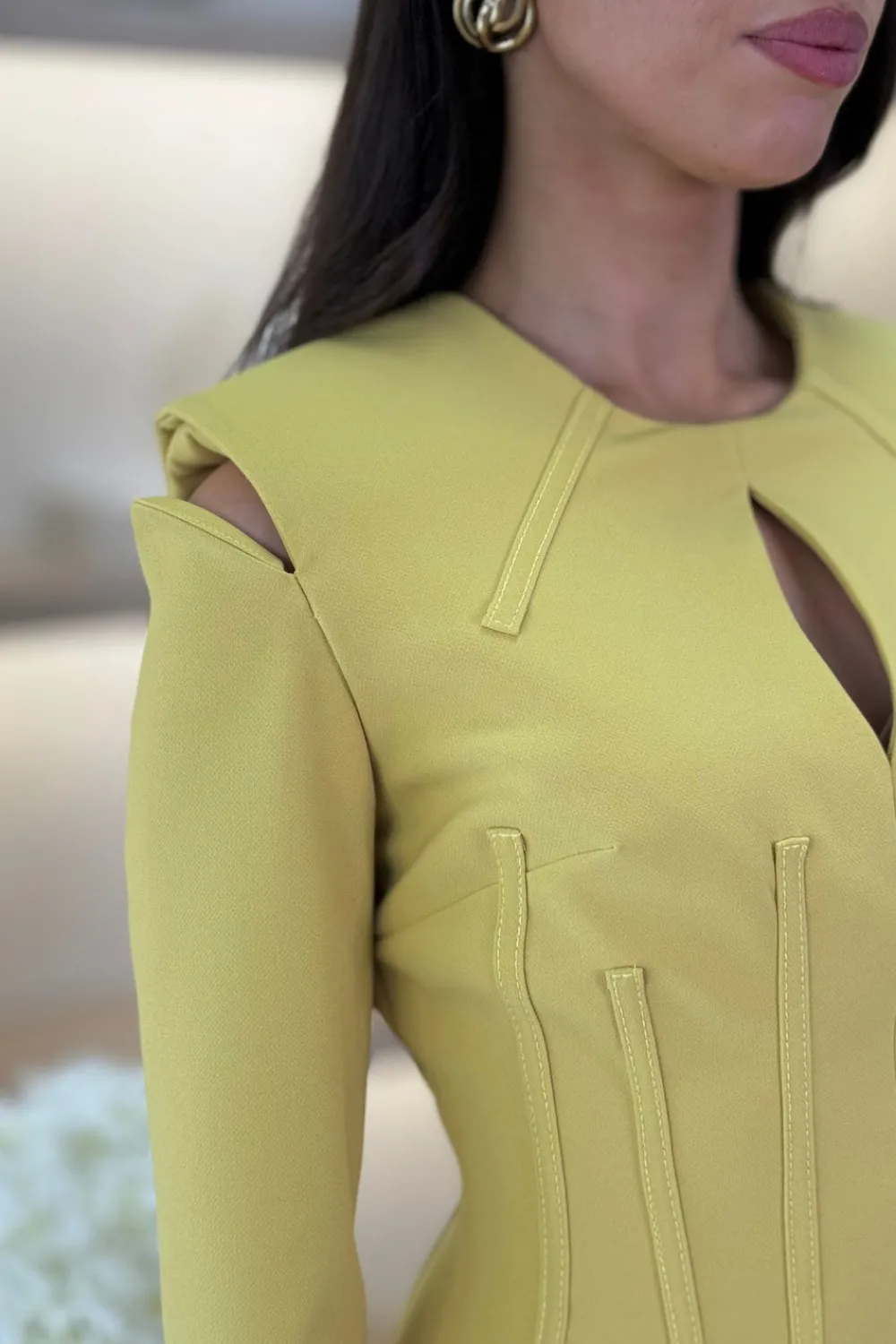 The Kayla Open Shoulder Dress in Mustard is the perfect blend of elegance and edginess. With its long sleeves, round neck, and cut out details on the front and shoulders, this knee-length dress is sure to turn heads. Designed with a back zip and padded shoulders, it provides both comfort and style. Stand out in this stunning mustard dress.