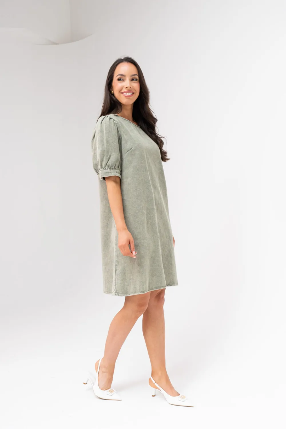 Elevate your wardrobe with this sophisticated Kendra Puff Sleeve Denim Dress in Khaki. Featuring a flattering round neck and distinctive button details at the shoulders and cuffs. The short puff sleeves add a contemporary feminine touch to the classic denim silhouette, creating a balanced look that transitions effortlessly from day to evening occasions.