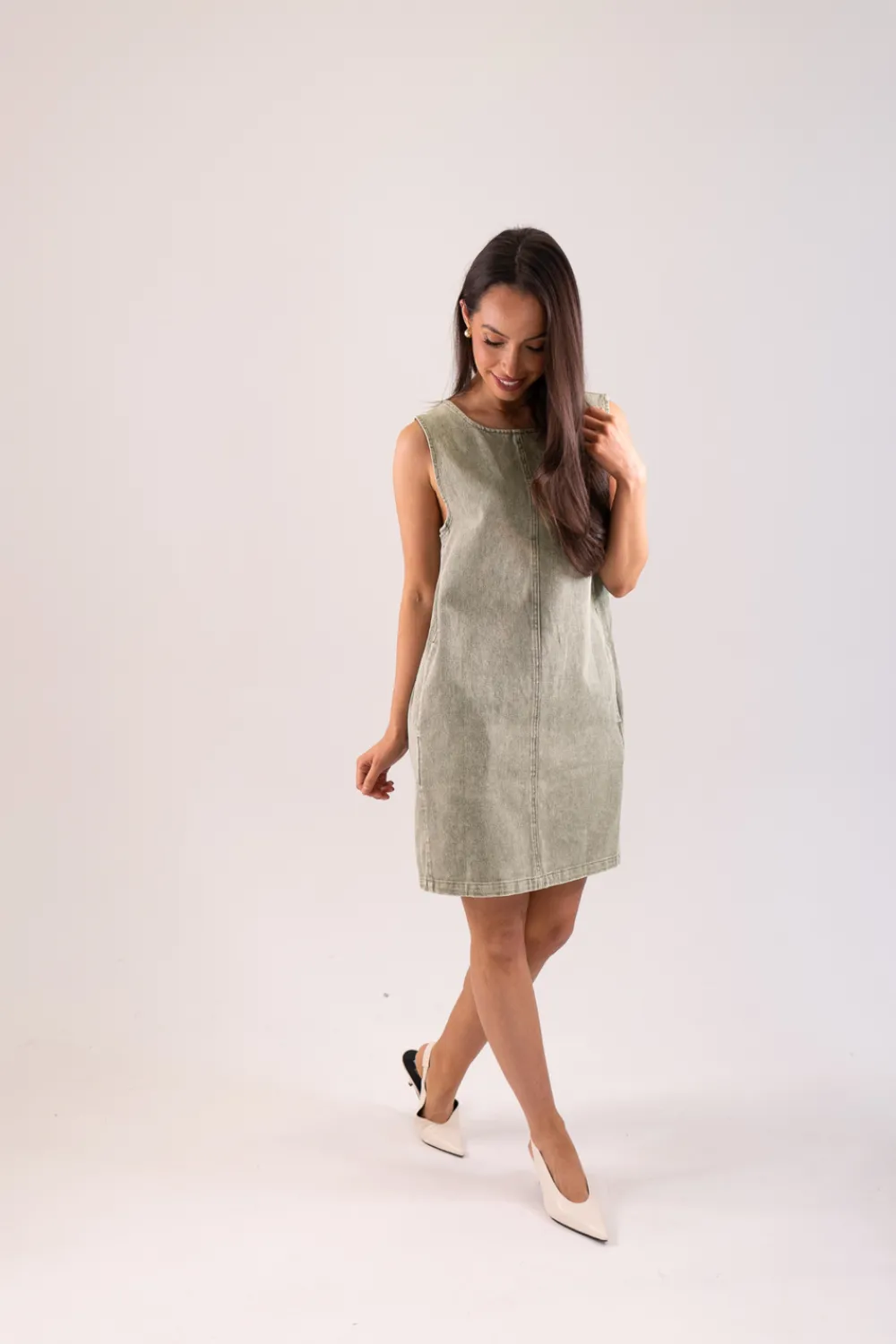 Introducing the Kiera Denim Shift Dress, perfect for your casual and chic wardrobe. This sleeveless dress features a round neck and seam detailing on the front, adding a touch of style to the light wash denim fabric. With convenient pockets, it’s both fashionable and functional.
