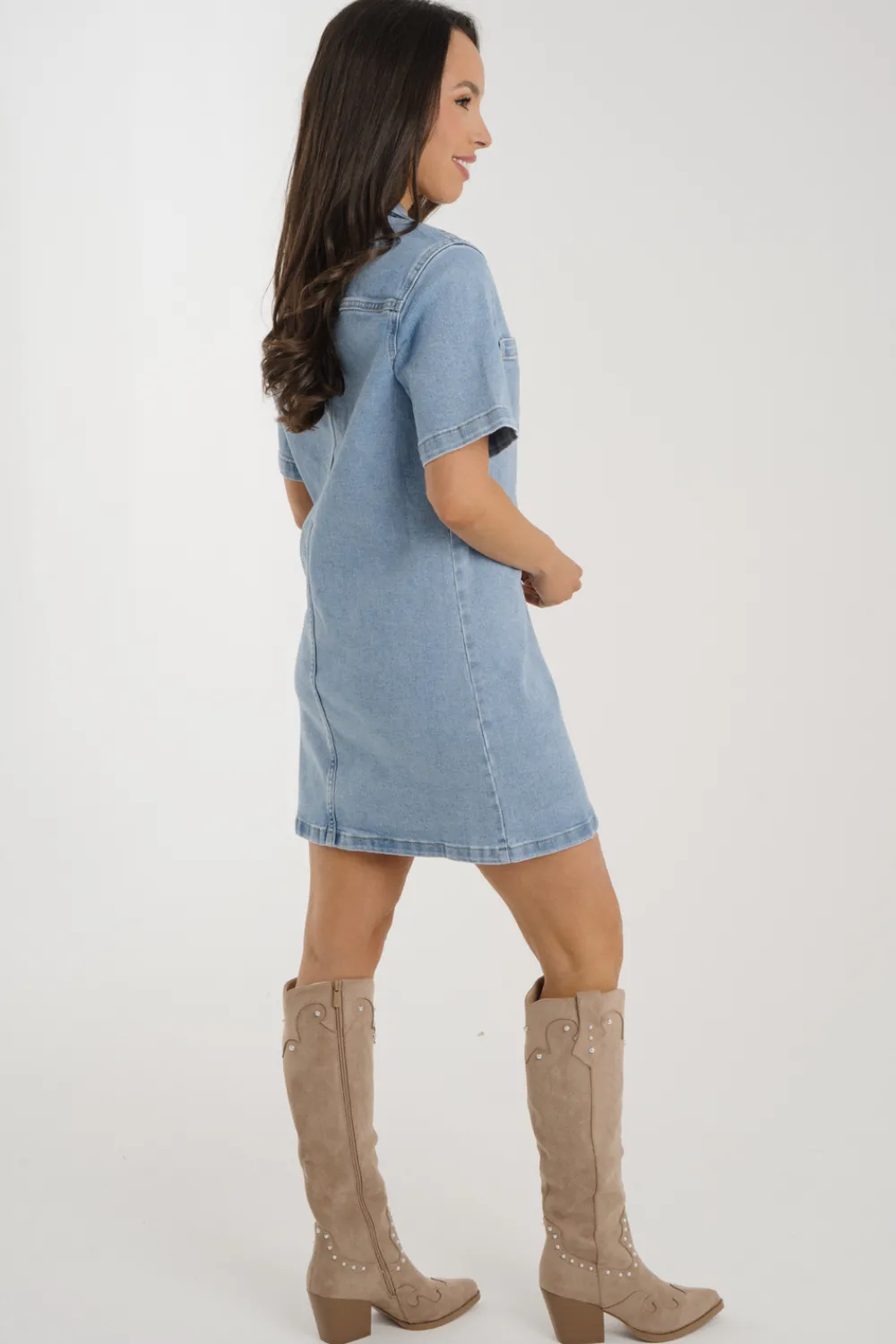 The Lynne Denim T-Shirt Dress In Light Wash is the perfect blend of comfort and style. Its collar and button front give it a touch of sophistication, while the short sleeves and pockets add convenience. Made of light wash denim, this short dress is a versatile addition to your wardrobe.