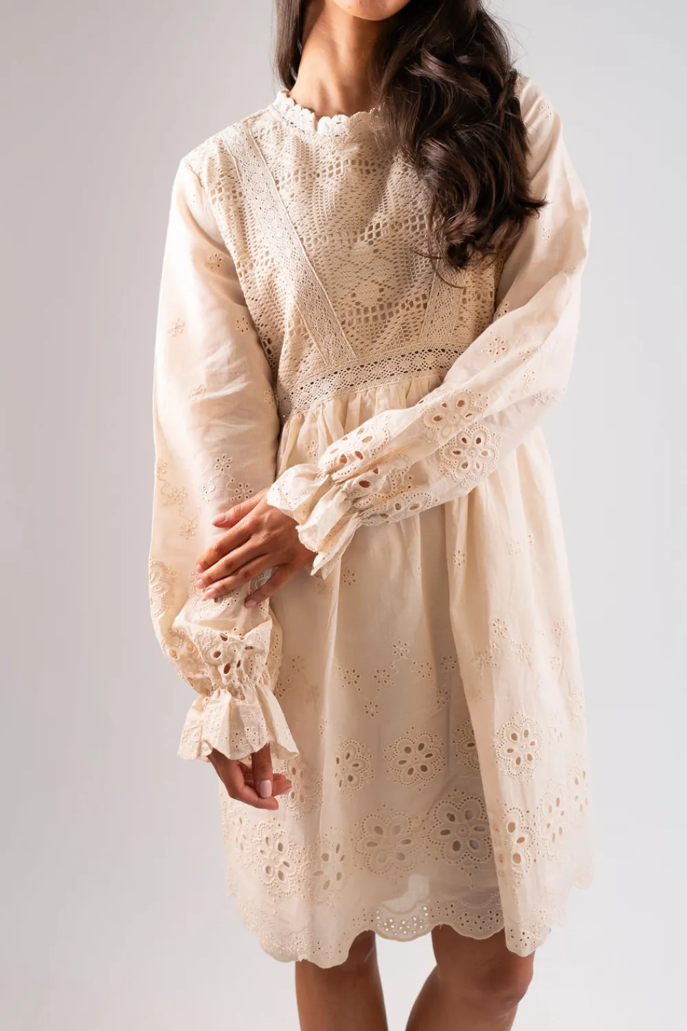 Discover a classic and sophisticated style with our Una Broderie Anglaise Dress in Black. This dress features a round neck and long sleeves with frill cuffs for added elegance. The short, lined design is adorned with beautiful broderie anglaise and crochet details on the top, making it a timeless and chic addition to your wardrobe.