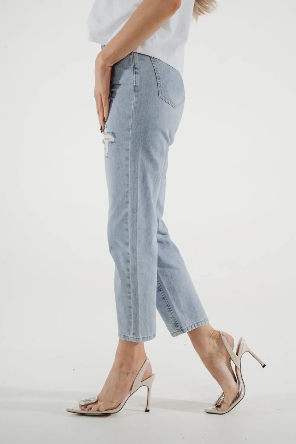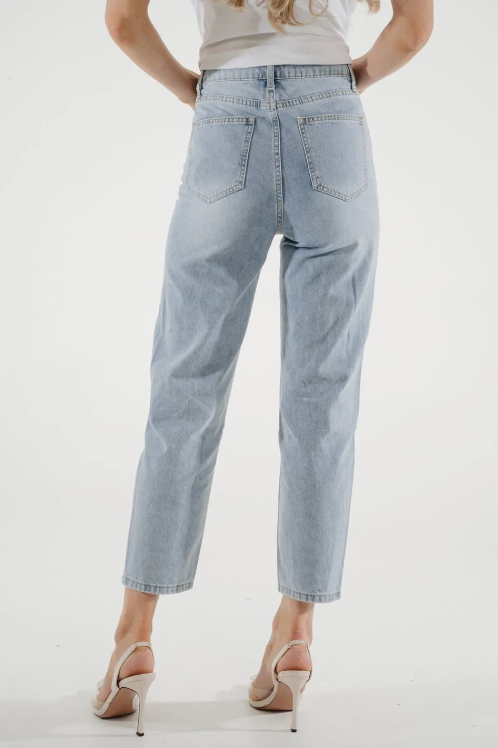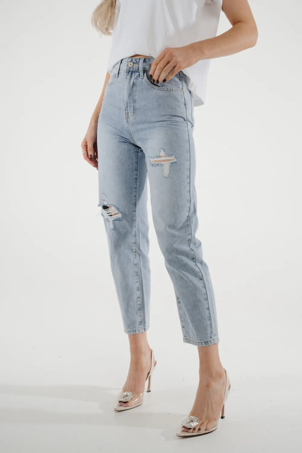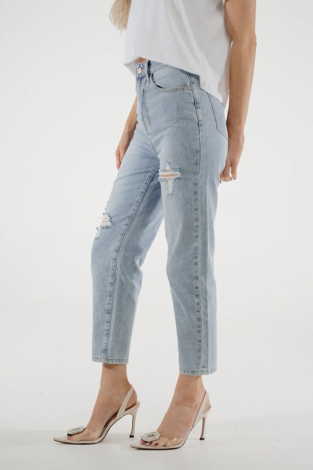 Experience the perfect combination of style and comfort with our Cindy Distressed Mom Jean. This high waist denim is designed for a flattering mom fit, complete with distressed details for an effortlessly cool look. Step up your fashion game with this light wash jean.