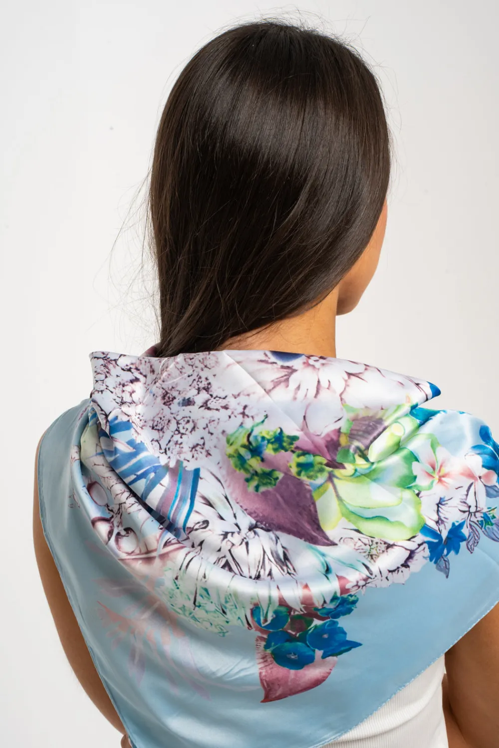 Introducing our Eden Floral Print Neck Scarf in Sky Blue. With its lightweight design, this scarf is perfect for adding a pop of colour to any outfit. Measuring 68cm x 68cm, it is versatile and suitable for all sizes. The beautiful floral print in a mix of sky blue shades adds a touch of elegance to your look.