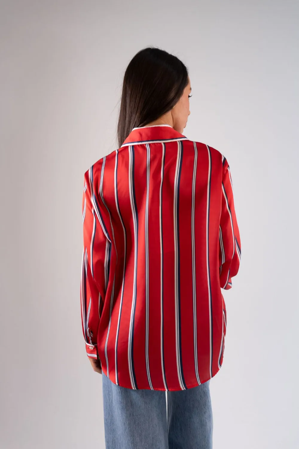 Expertly designed with a regular fit and a striking red satin fabric, the Alana Striped Satin Shirt is a must-have for any fashion-forward individual. The navy and white stripes add a touch of sophistication, while the collar and front pocket provide both style and functionality. Finished with long sleeves and a button front and cuffs, this shirt is perfect for any occasion.