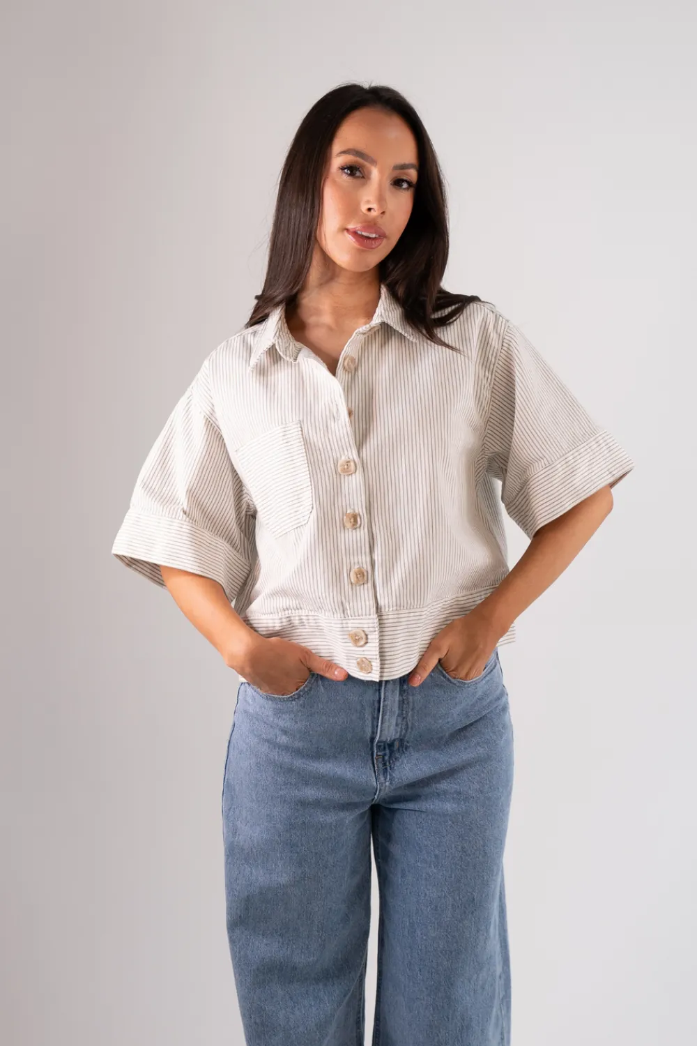 This Cindy Stripe Shirt in Green features a classic collar, button front, and front pocket for a timeless look. Made of 100% cotton, this short sleeve shirt is comfortable and stylish. The green stripe adds a touch of colour to any ensemble.