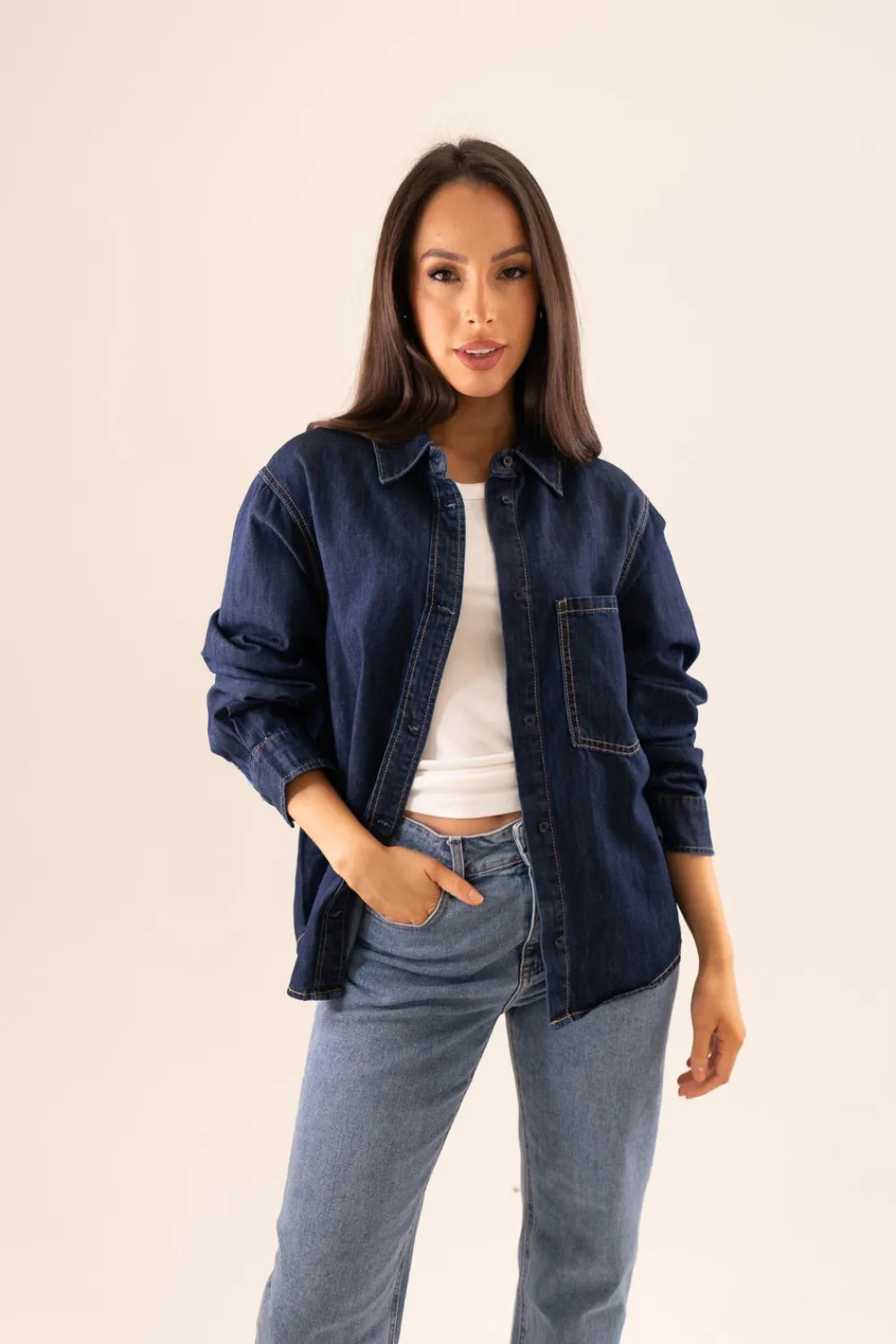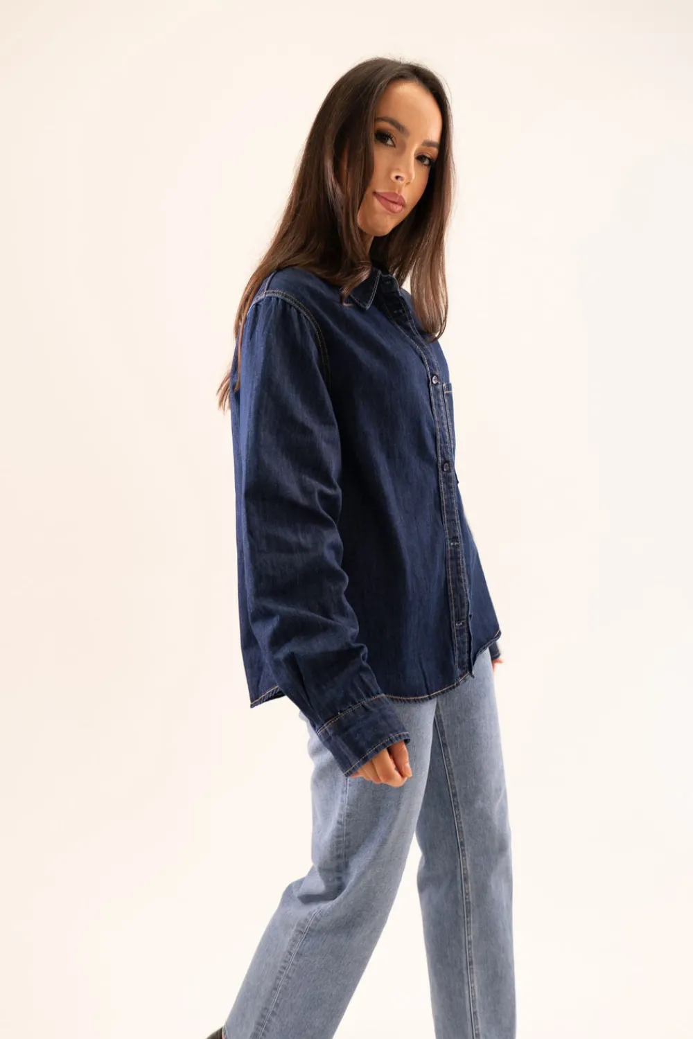 This Freya Denim Shirt in Dark Wash is a must-have for any wardrobe. The dark wash denim gives a classic, versatile look, while the collar, button front, and cuffs provide a polished touch. With long sleeves and a pocket for added convenience, this shirt is a perfect combination of style and functionality.
