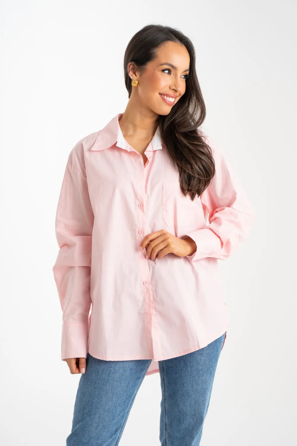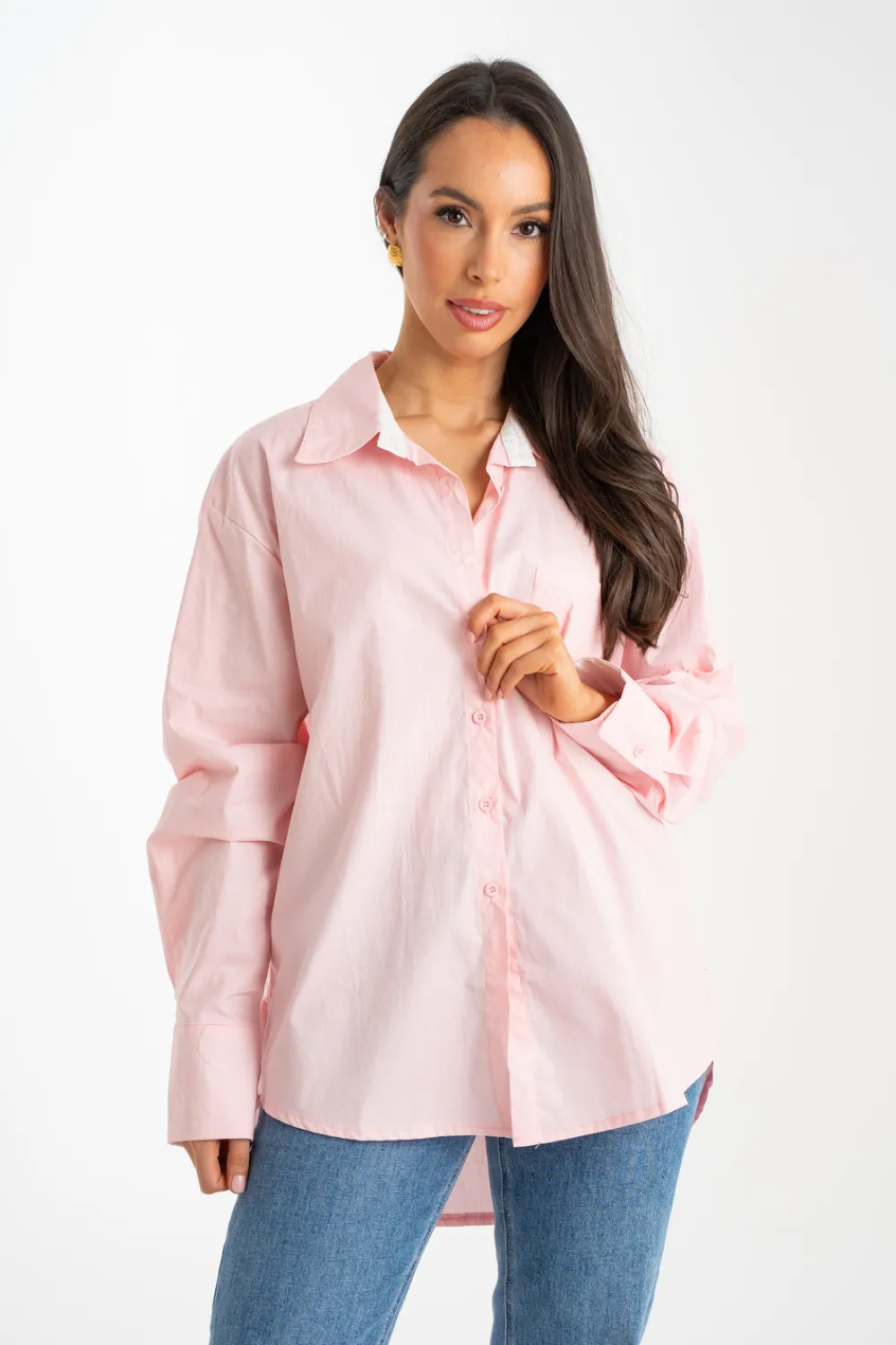 This Kiera Contrast Cuff Shirt in Pink features a stylish collar, button front, and long sleeves for a classic look. Made with 100% cotton, the shirt offers a comfortable and breathable fit. The contrast turn up cuffs add a touch of elegance, making it a versatile wardrobe staple.