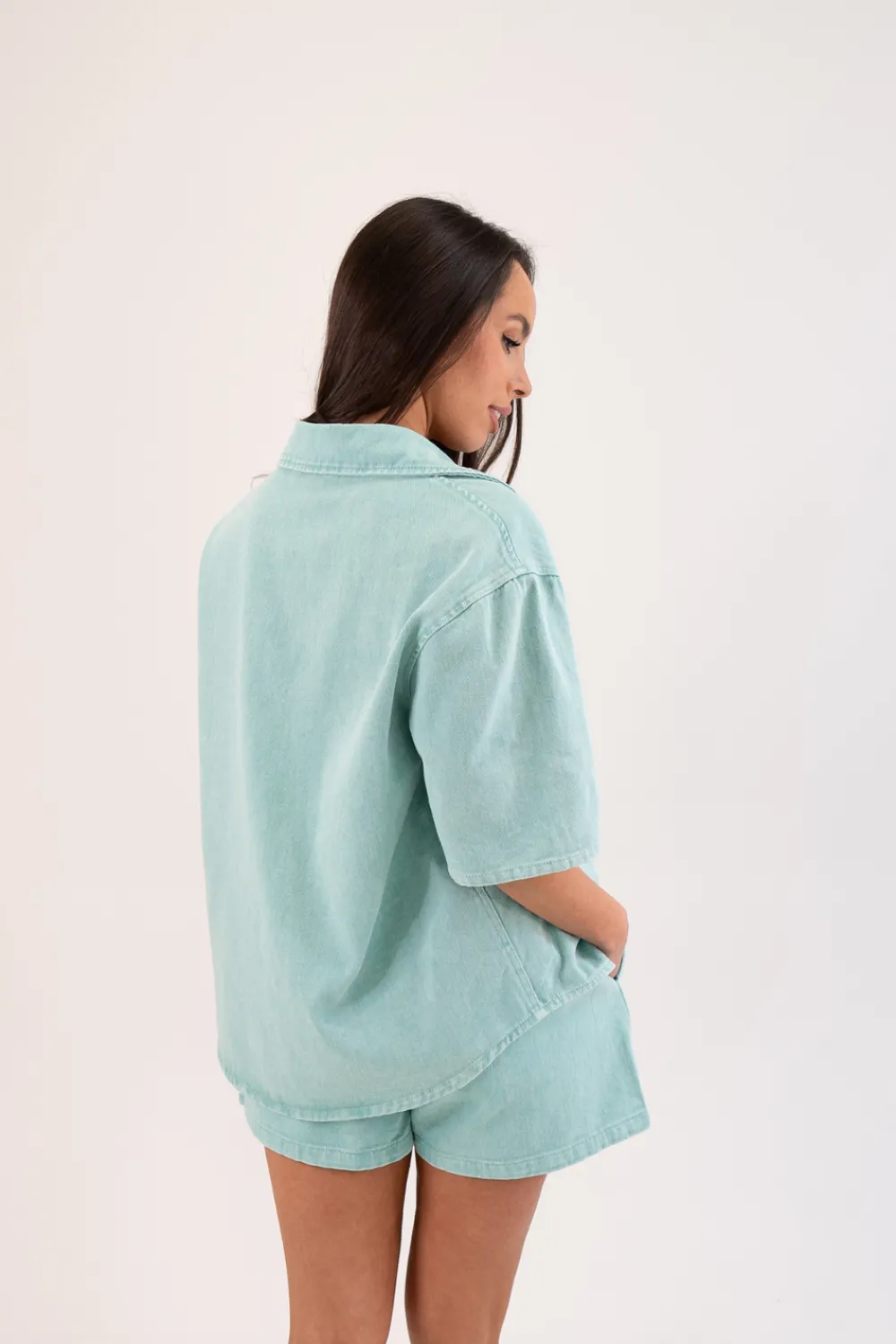 The Kiera Denim Shirt in Turquoise is a versatile addition to any wardrobe. With a classic collar and button front, as well as a convenient front pocket, this short-sleeved shirt is made from a comfortable and stylish turquoise denim fabric. Complete the look with the matching shorts, available separately. Upgrade your style with this must-have piece.