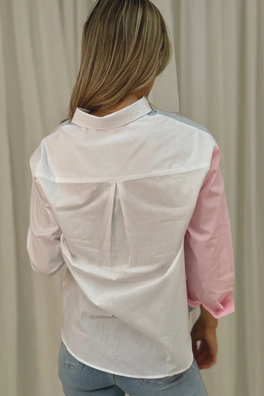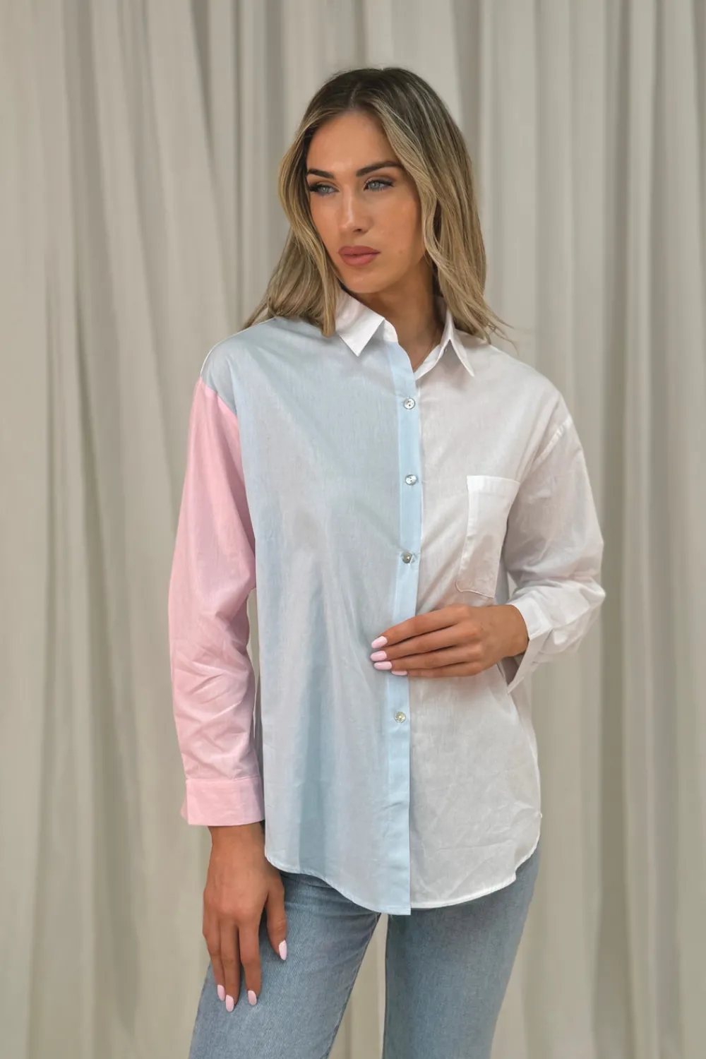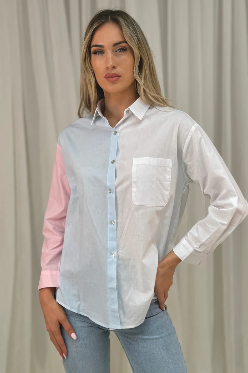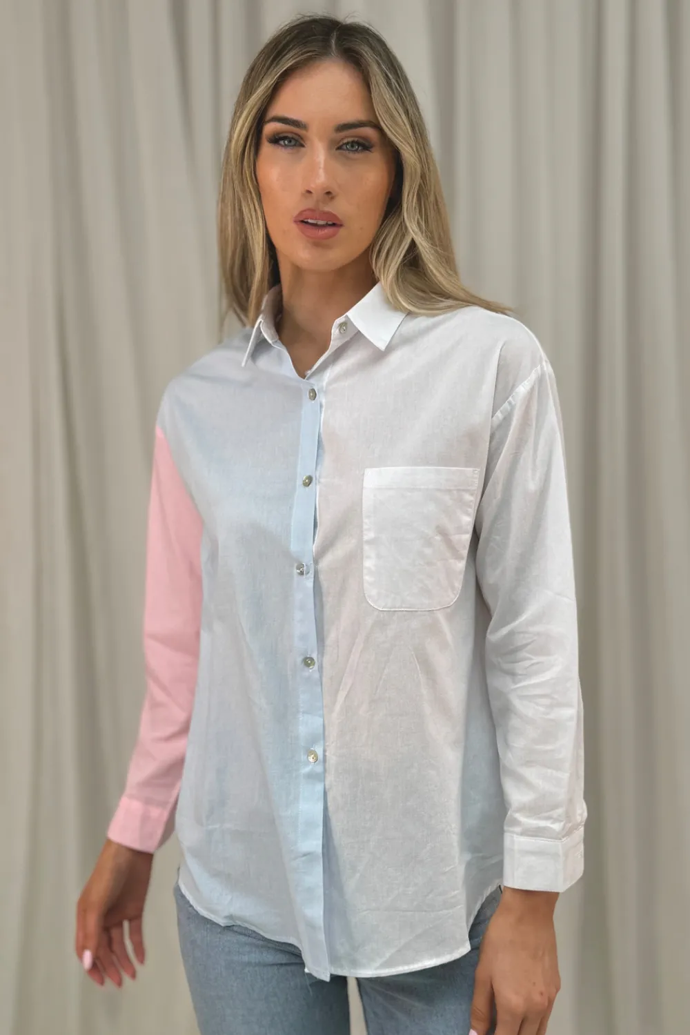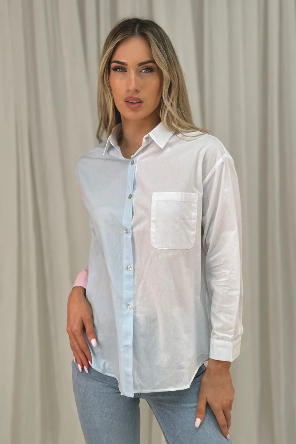 Expertly crafted with a collar and button front, the Megan Contrast Shirt is perfect for professional and casual occasions. Its long sleeve design and cotton material provide comfort, while the white, blue, and pink contrast adds a touch of style. Effortlessly elevate your wardrobe with this versatile piece.