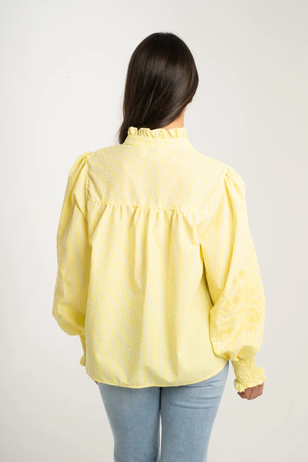 Discover the perfect blend of comfort and style with our Millie Embroidered Stripe Shirt. Crafted from soft and breathable cotton, this shirt features a V-neckline, button front, and elegant broad cuffs. The yellow and white striped design is elevated with delicate floral embroidery details, making it a must-have addition to your wardrobe.