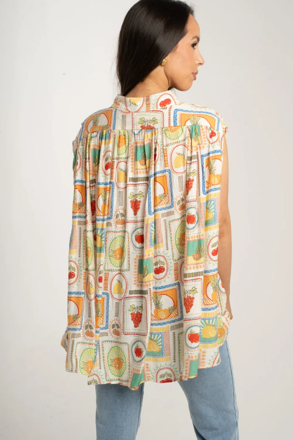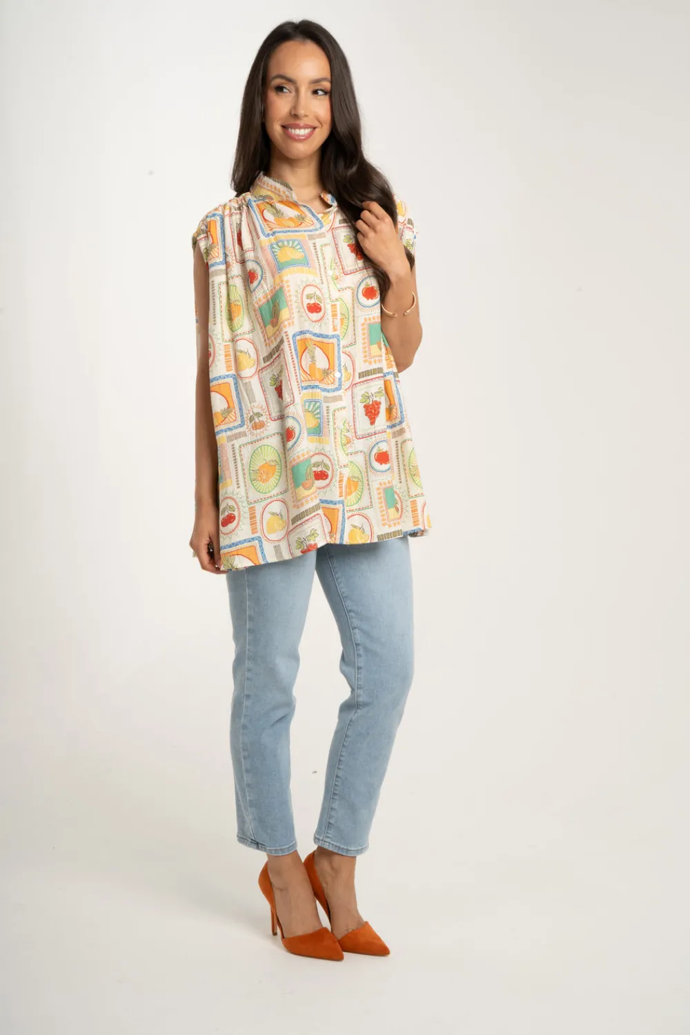 The Millie Fruit Print Shirt In Multi is the perfect blend of style and functionality. With a classic collar and sleeveless design, this shirt features a button front for easy wear. The multi-colour square detail and playful fruit theme print add a touch of fun to any outfit. Stay on trend with this versatile and fashionable shirt.