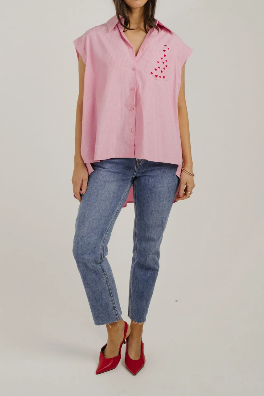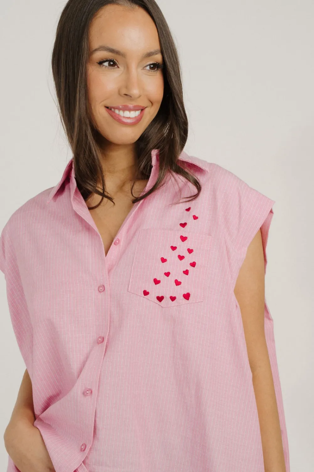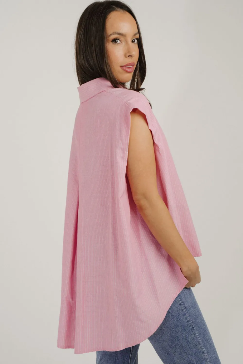 Expertly tailored with a classic collar and button front, the Millie Pinstripe Sleeveless Shirt in Pink features delicate pinstripes for a timeless look. Designed with side splits and a heart detail pocket, this shirt provides both style and functionality. Perfect for any occasion, this shirt is a wardrobe must-have.