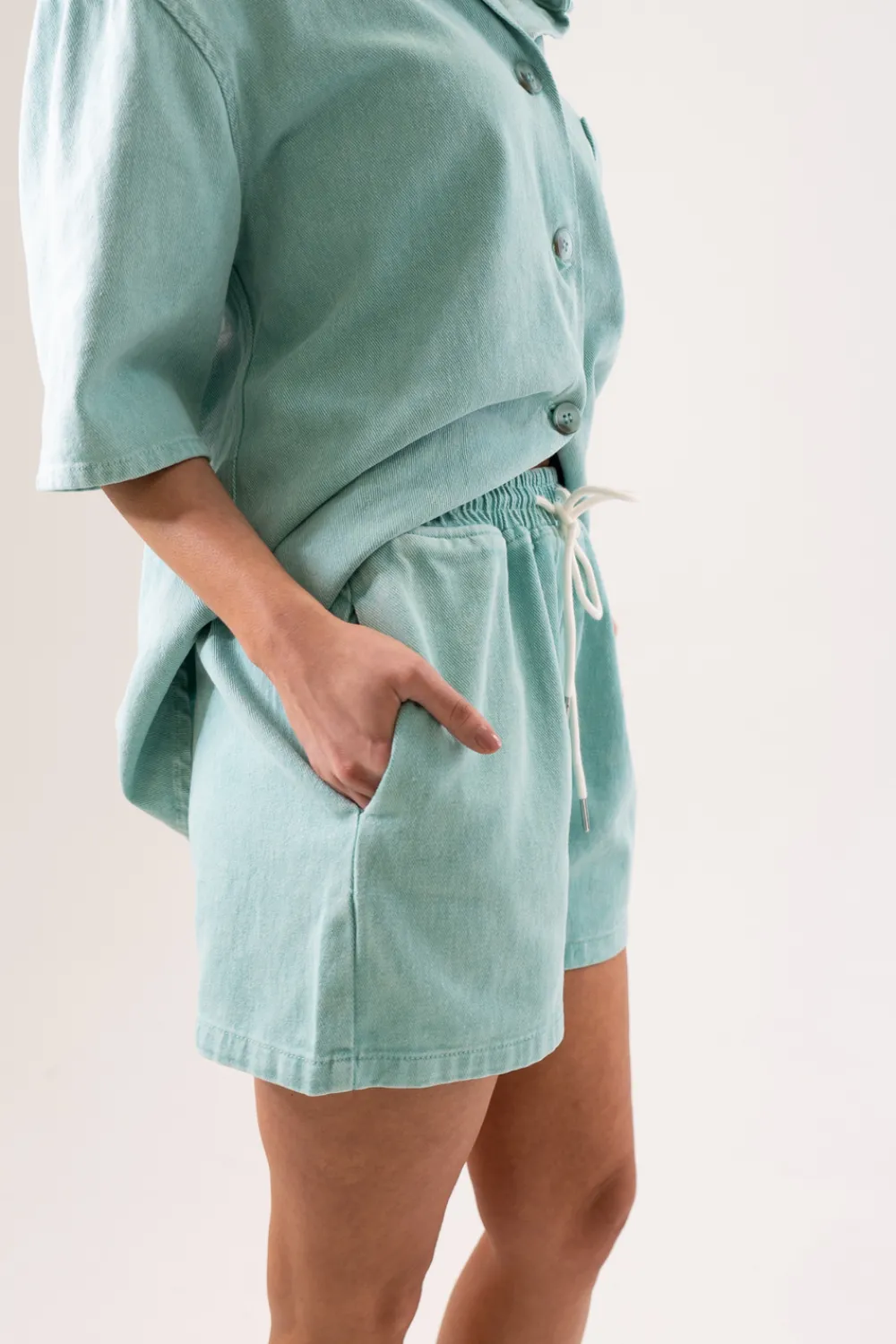 Expertly designed for ultimate comfort and style, our Kiera Denim Shorts in Turquoise are a must-have addition to your summer wardrobe. The elasticated, drawstring waist ensures a perfect fit, while the pockets add functionality. Complete the look with our matching shirt for a cohesive and chic outfit. Made from high-quality turquoise denim for a trendy and timeless look.