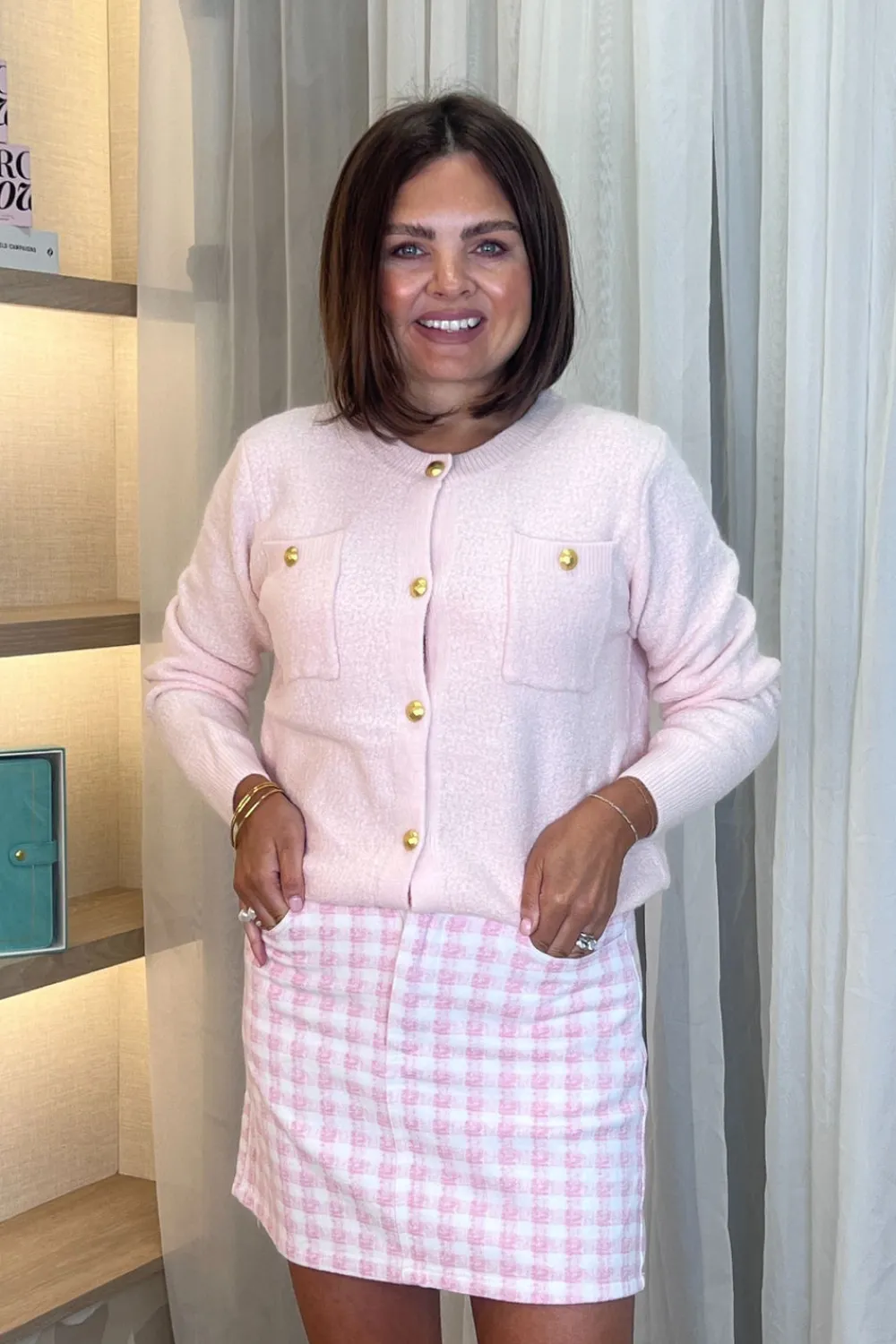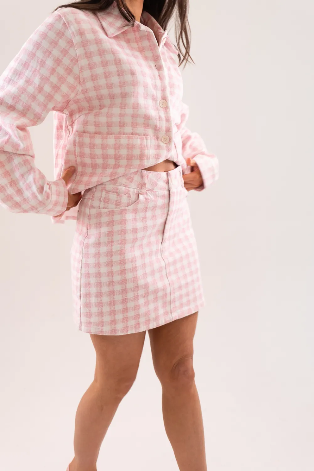 Step into spring with our Daisy Gingham Skirt in Pink. This mini skirt boasts a stunning pink and white gingham pattern, perfect for a stylish and fresh look. With a zip and button front, as well as convenient pockets, this skirt is both fashionable and functional. Made of 100% cotton, it offers both comfort and quality. Complete the look with our matching trousers and jacket.