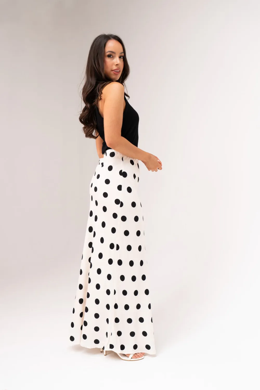 Complete your stylish look with our Ella Polka Dot Slip Skirt in Cream. Featuring a side zip, this maxi skirt is effortlessly chic and versatile. Its black polka dot pattern adds a touch of playful elegance. Pair it with the matching vest top for a coordinated ensemble.