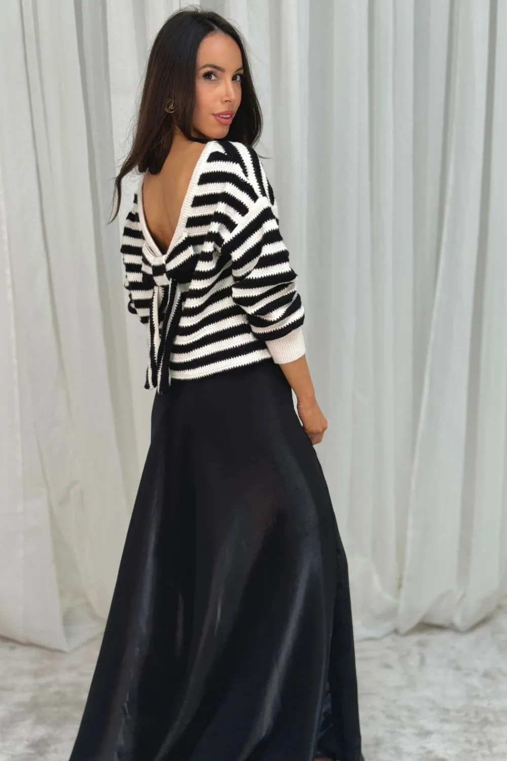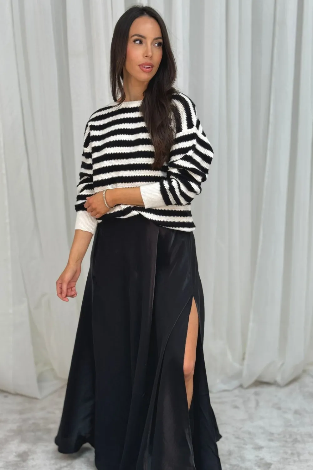 The Elsa Maxi Skirt in Black is a must-have addition to any wardrobe. Its elegant maxi length and subtle sheen make it perfect for any occasion. The broad waistband provides a comfortable fit while the side split adds a touch of sophistication. Stay chic and stylish with this versatile black skirt.