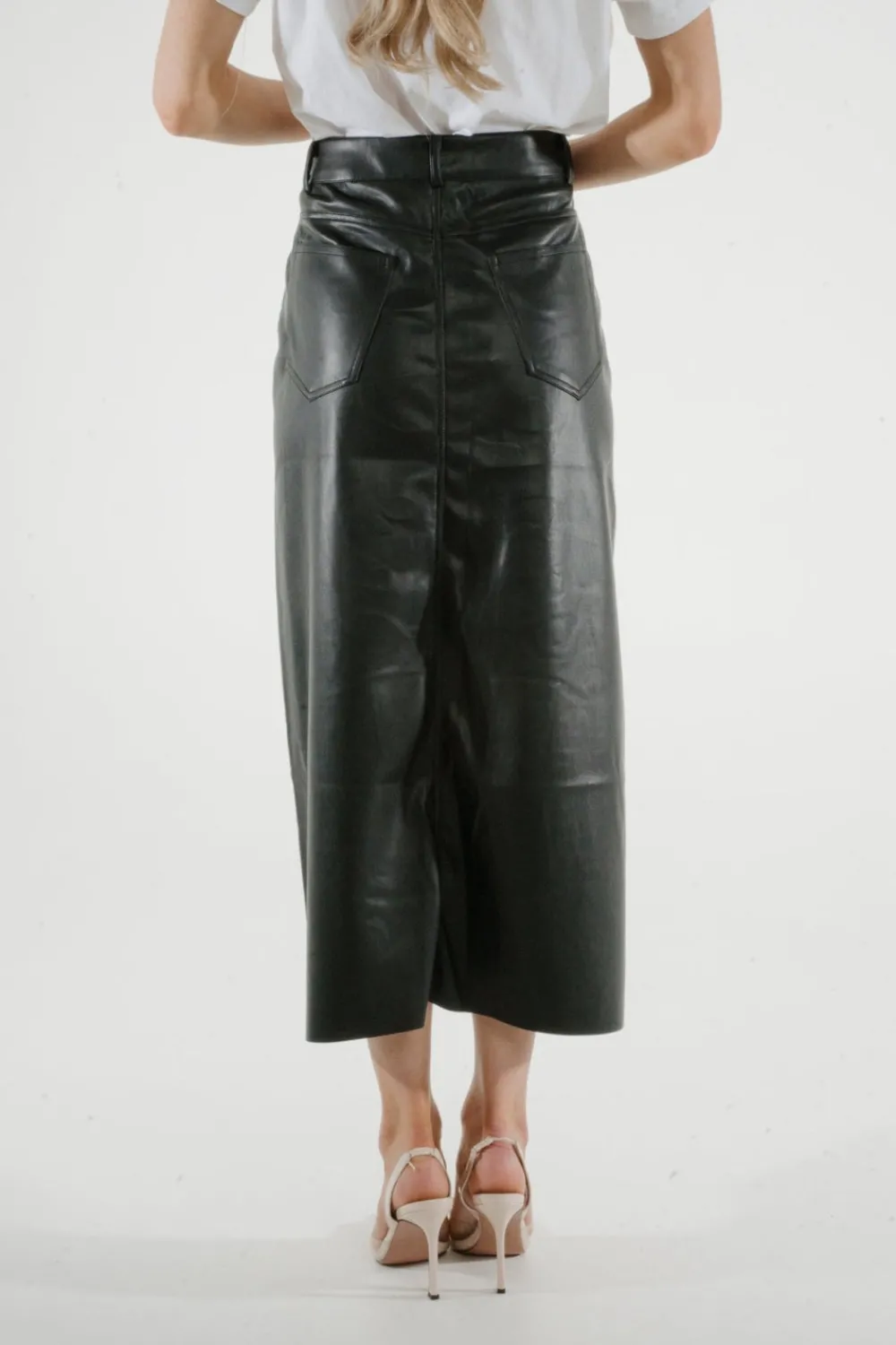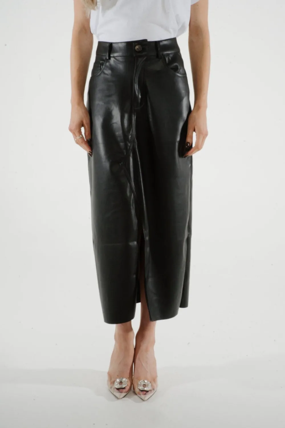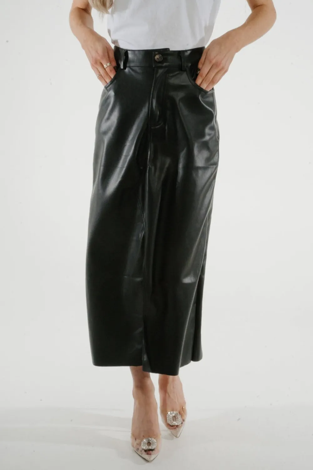 Experience the sleek and sophisticated style of our Jane Faux Leather Midi Skirt. Made with faux leather and featuring a front split and pockets, this midi skirt is both stylish and functional. The button waist adds an extra touch of elegance, making it the perfect addition to any wardrobe.