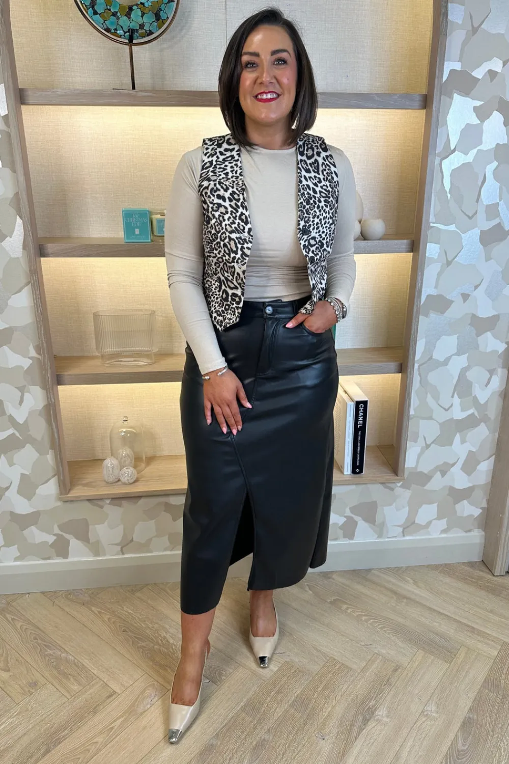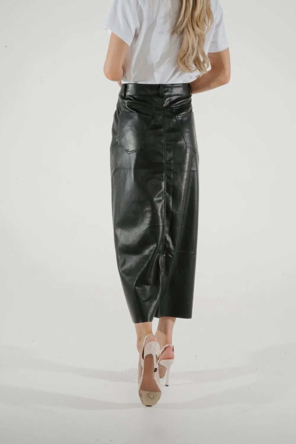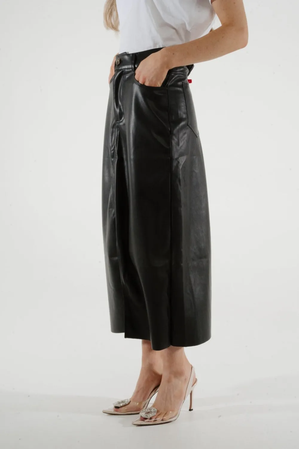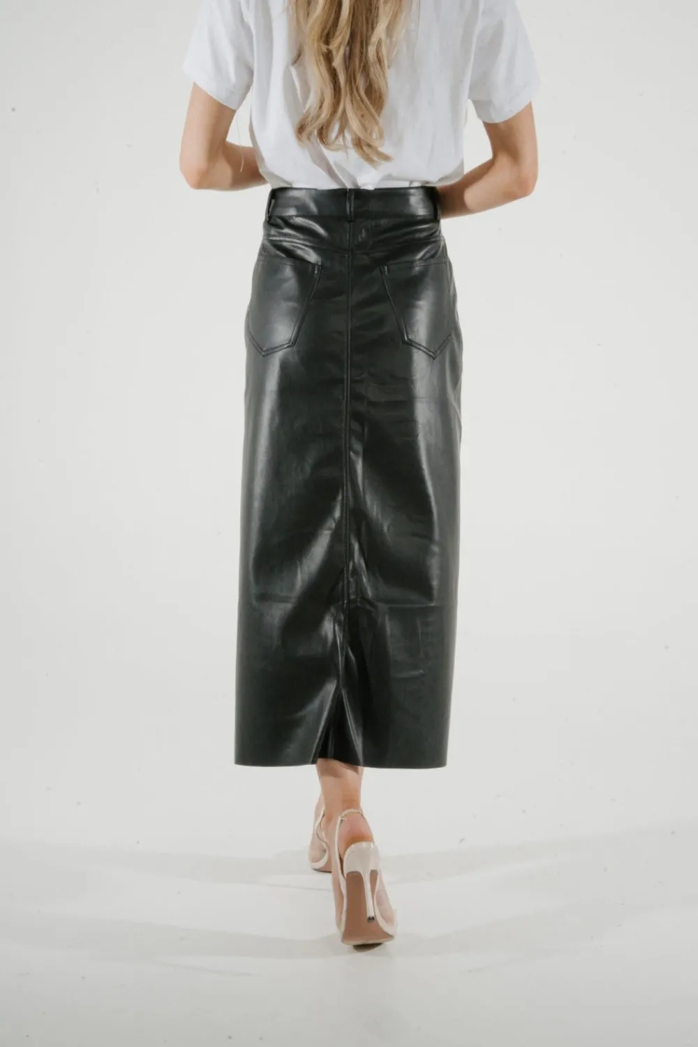Experience the sleek and sophisticated style of our Jane Faux Leather Midi Skirt. Made with faux leather and featuring a front split and pockets, this midi skirt is both stylish and functional. The button waist adds an extra touch of elegance, making it the perfect addition to any wardrobe.