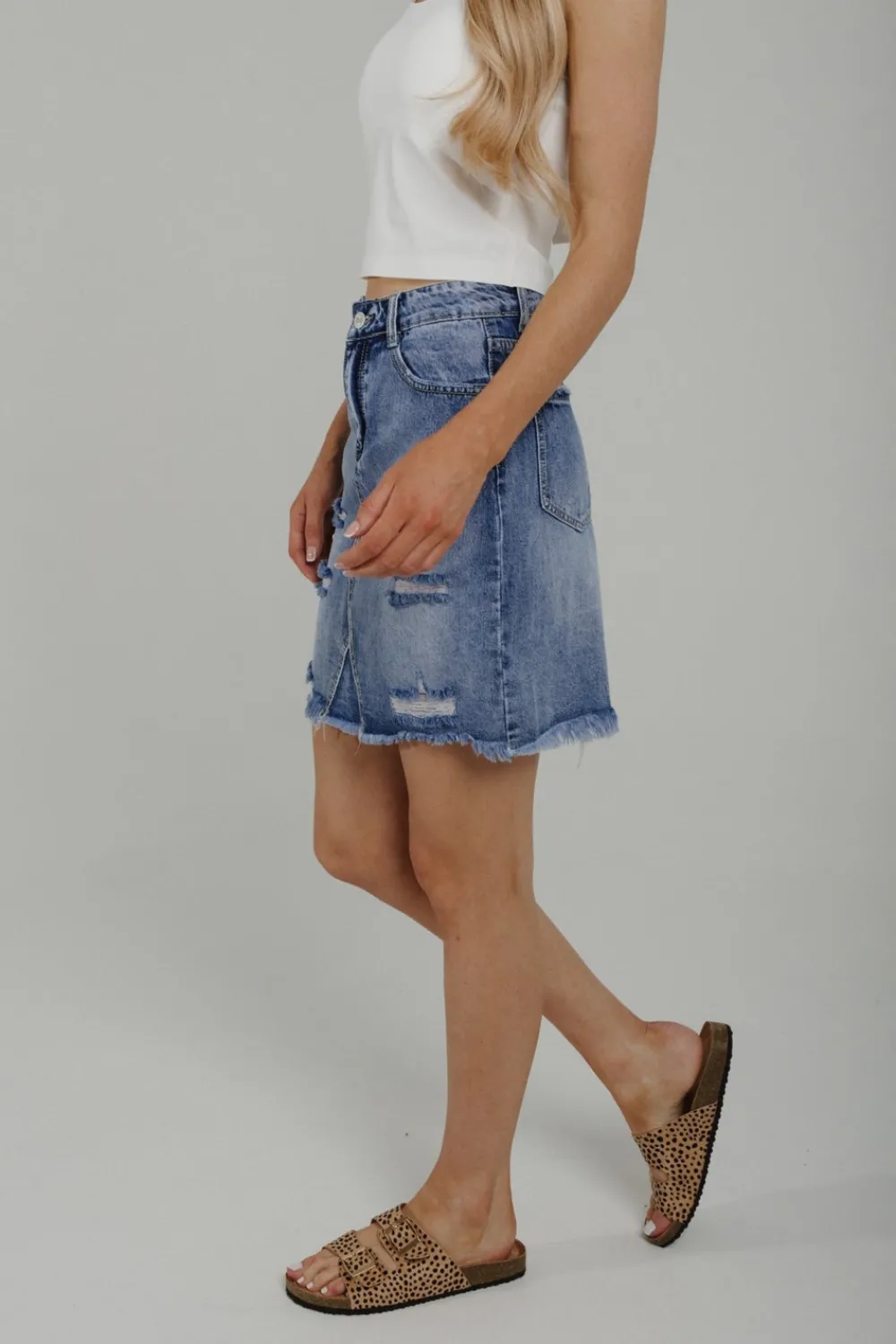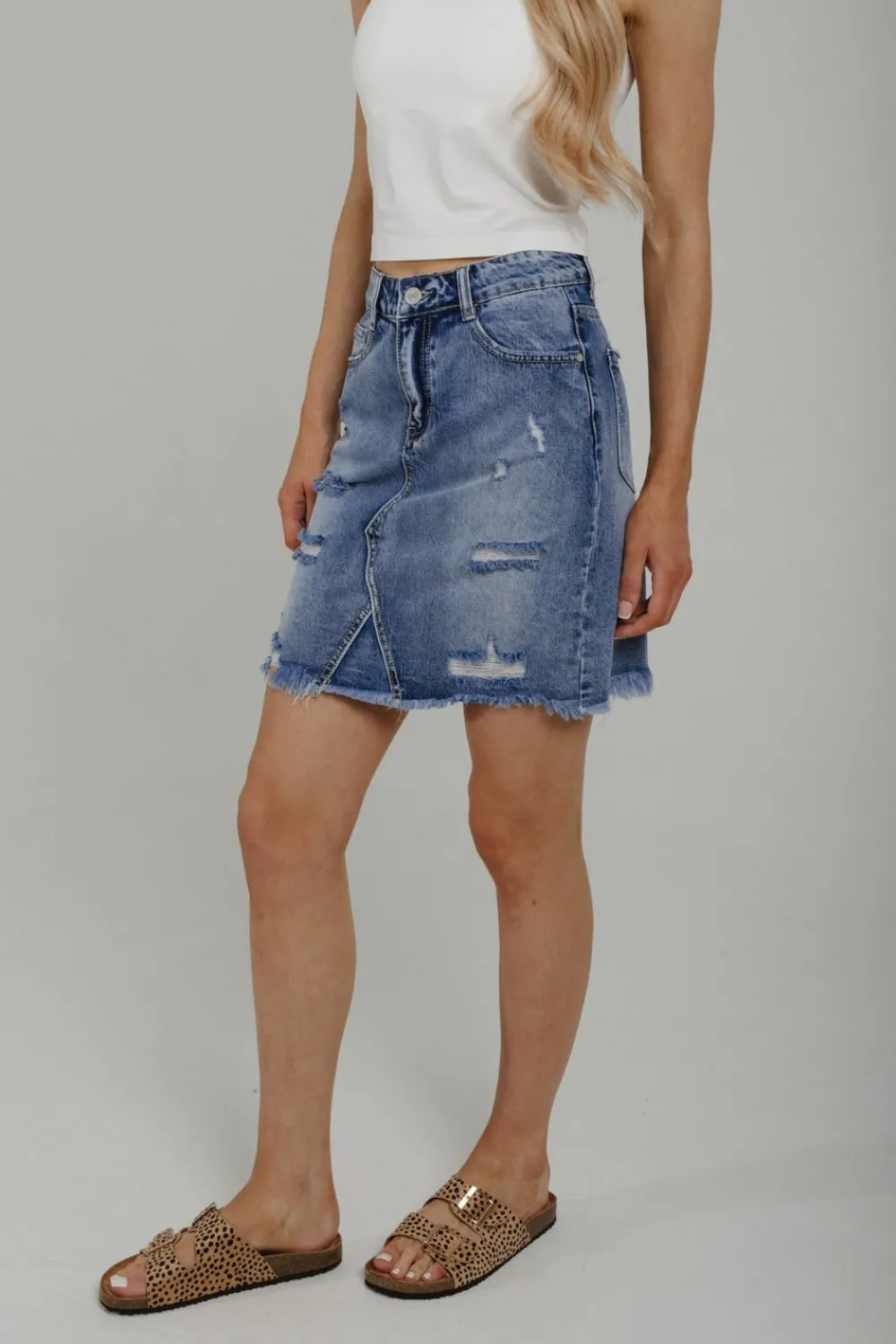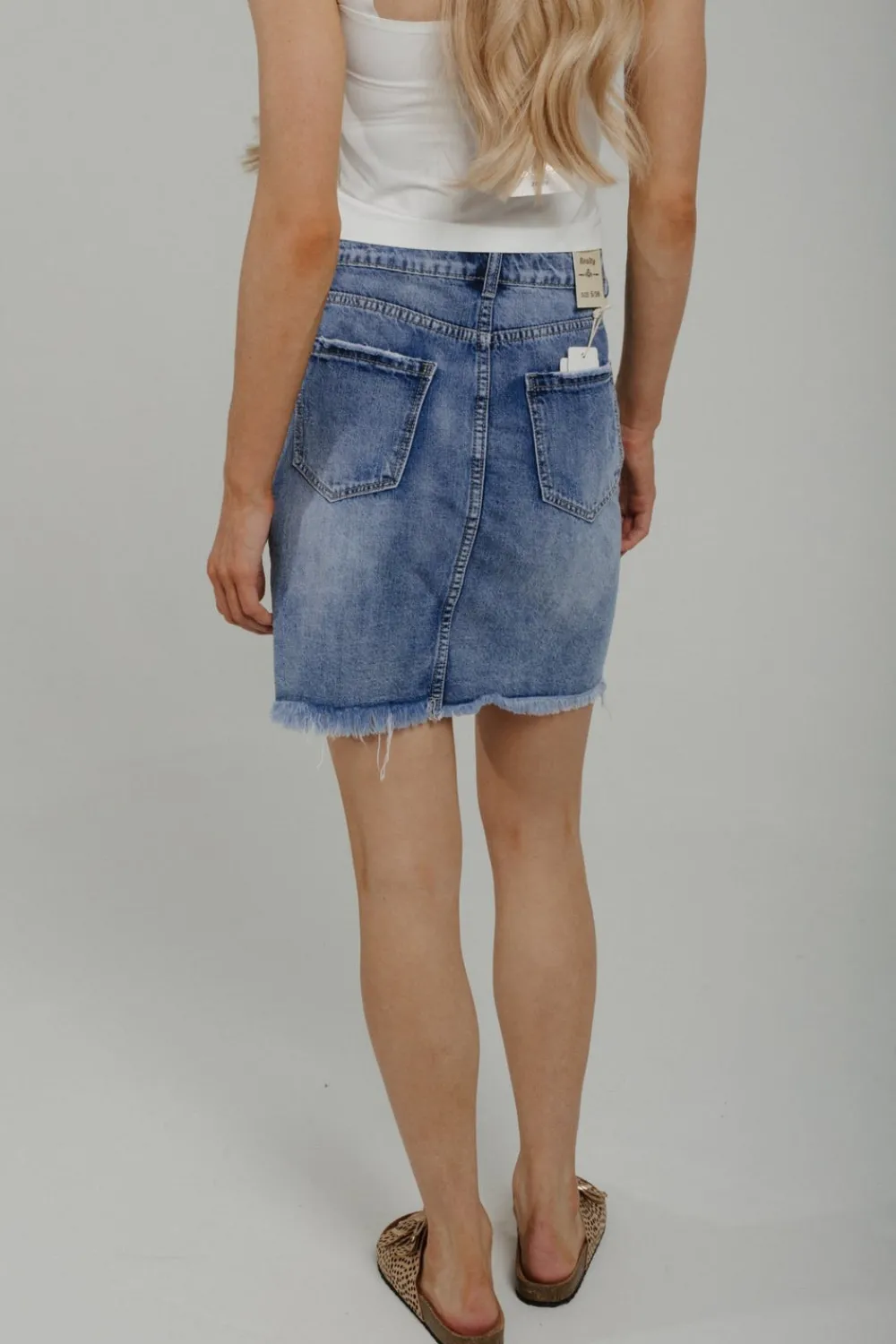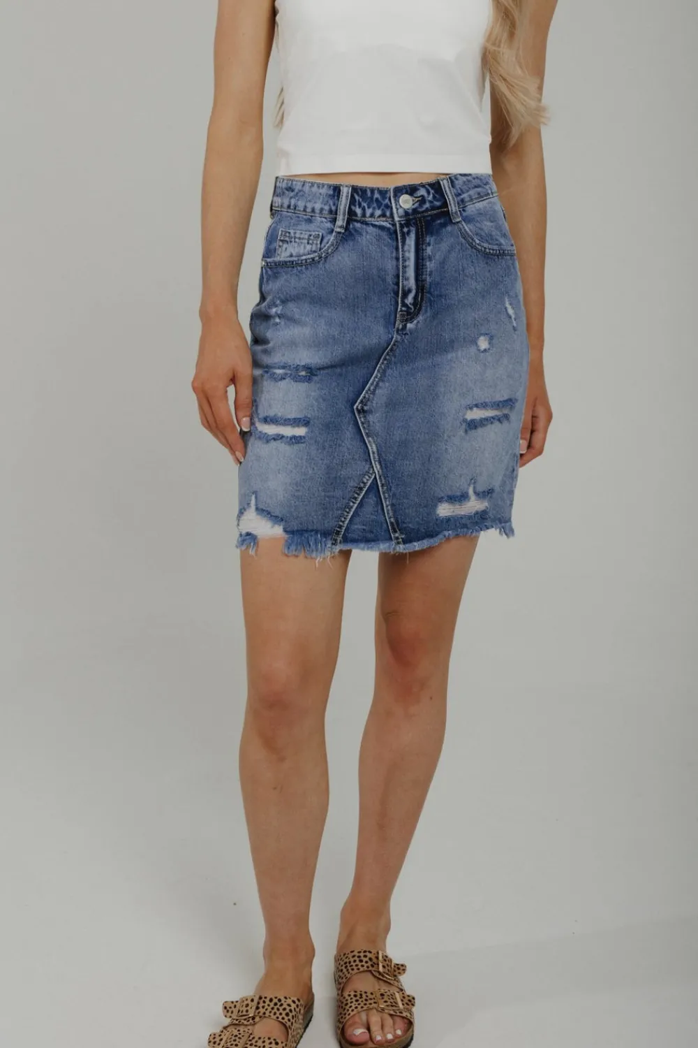 DistressedMid wash Mini Skirt Frayed hem