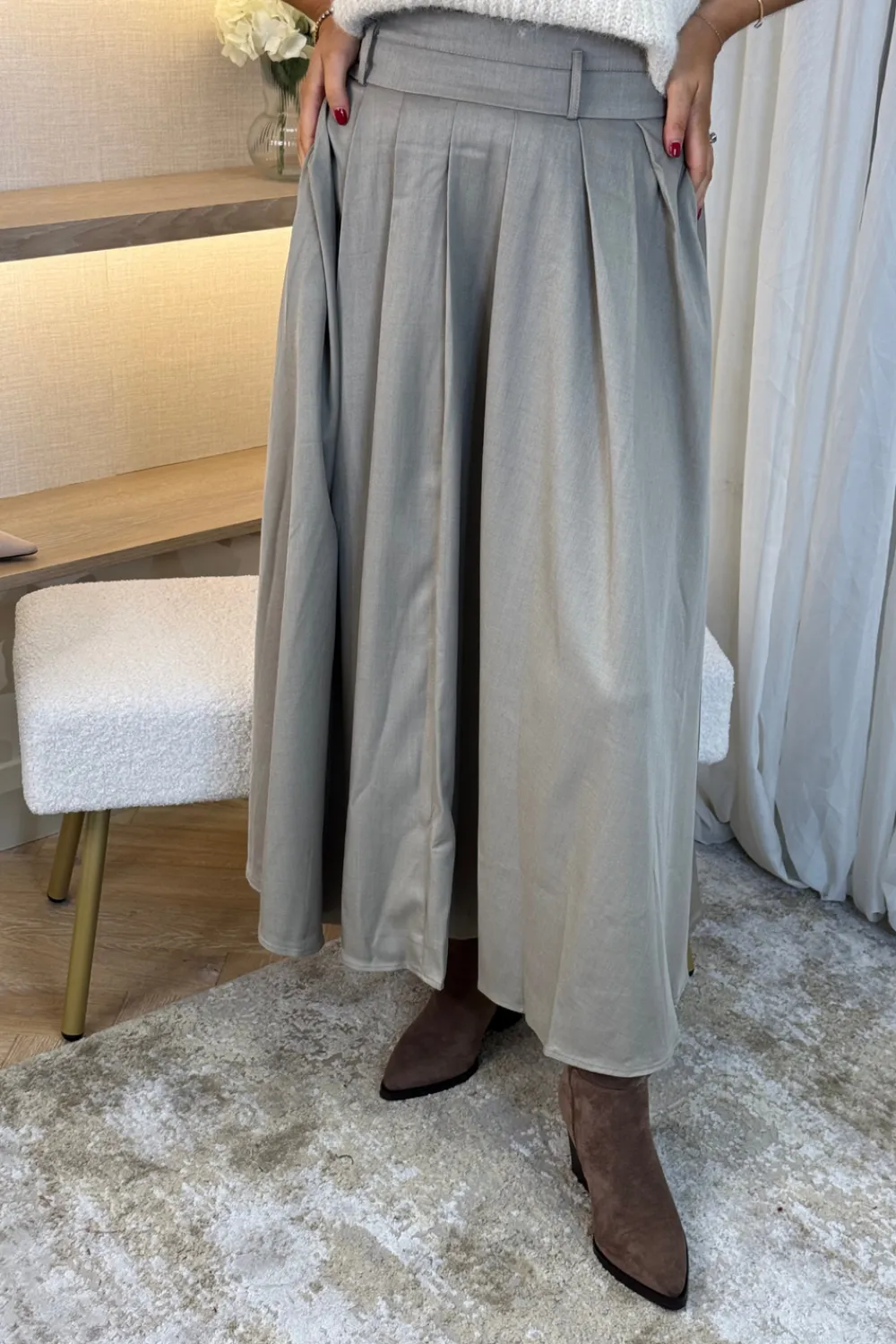 The Willow Maxi Skirt in Grey features a full skirt with pleats for a flattering and flowy look. The broad waistband offers both comfort and style, while pockets provide functionality. Made from high-quality, soft grey fabric, this maxi skirt is perfect for any occasion.
