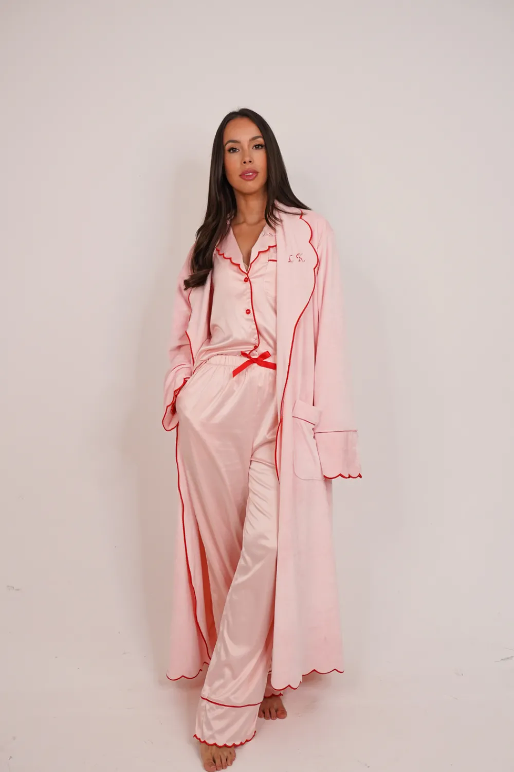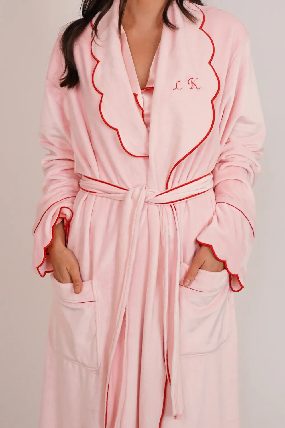 Introducing the Love Laura Trim Robe, a beautiful and luxurious robe in pink with red scallop trim. Add a personal touch with available personalisation on the lapel. With a detachable tie belt and convenient pockets, this robe is the perfect addition to your bedtime routine. Complete the look with matching Love Laura pyjamas.