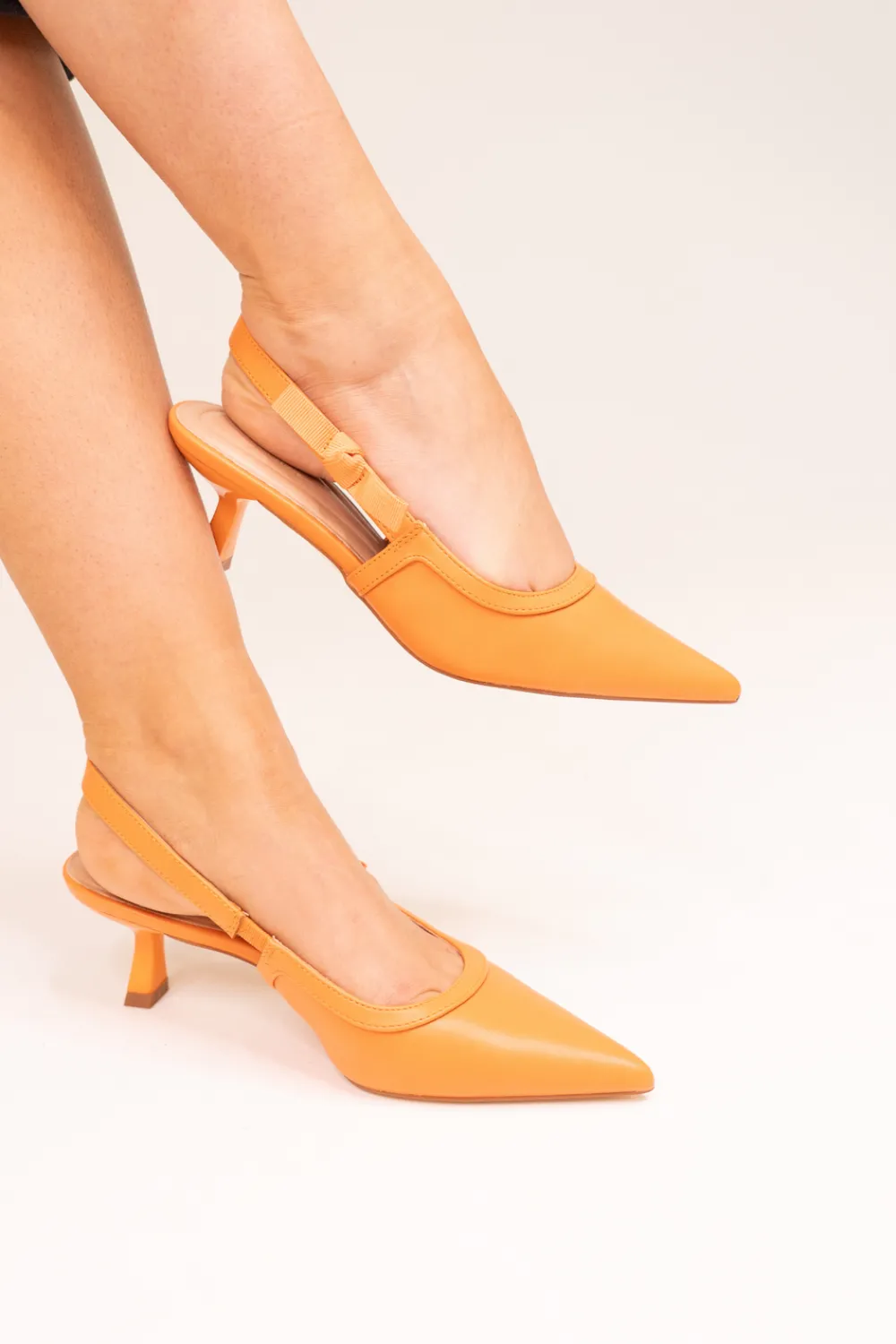 Elevate your style with the Lauren Slingback Heel in orange. Made with synthetic material and featuring a pointed toe, buckle detail, and slingback design, these kitten heels are perfect for any occasion. Their vibrant orange colour adds a pop of colour to any outfit, while the low heel provides comfort without sacrificing style. Expertly crafted for the modern and fashionable woman.