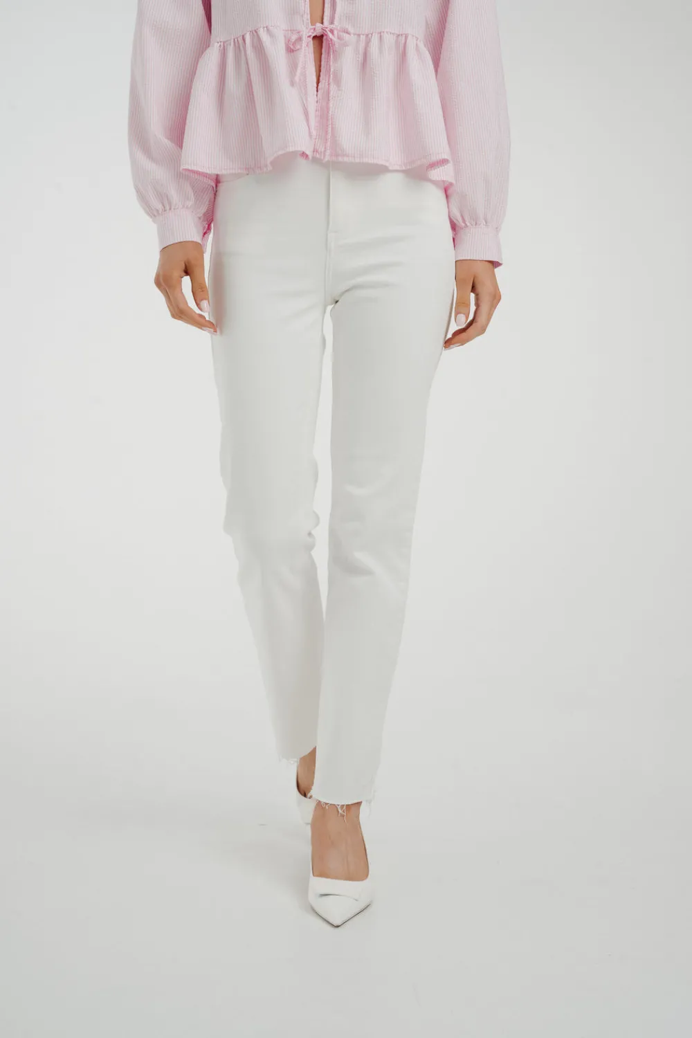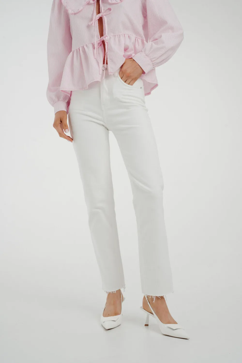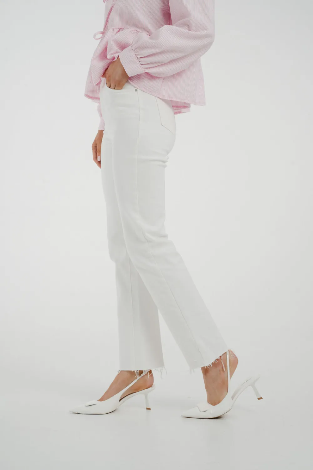The Lynne Straight Leg Jean In White is the perfect combination of style and comfort. Its high waist design flatters your figure, while the stretch fabric allows for easy movement. The classic straight leg cut is elevated by the crisp white colour and frayed hem, making these jeans a versatile and trendy addition to your wardrobe.