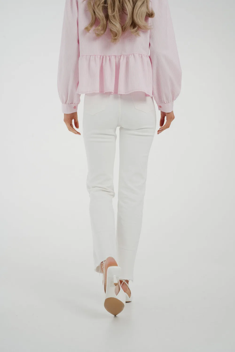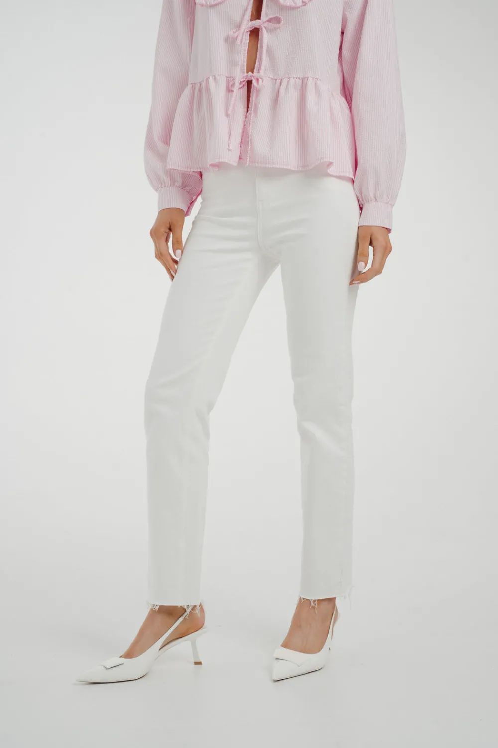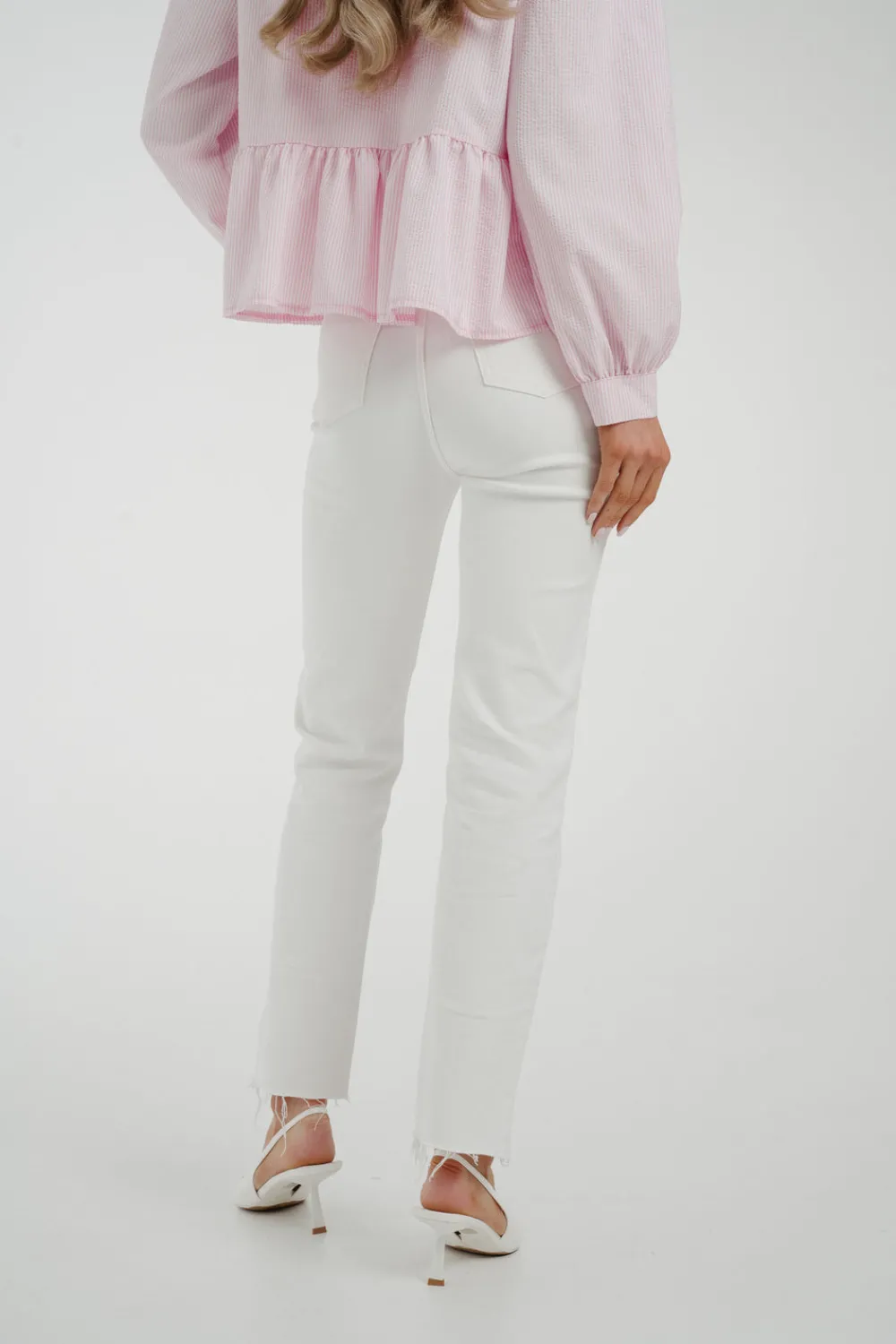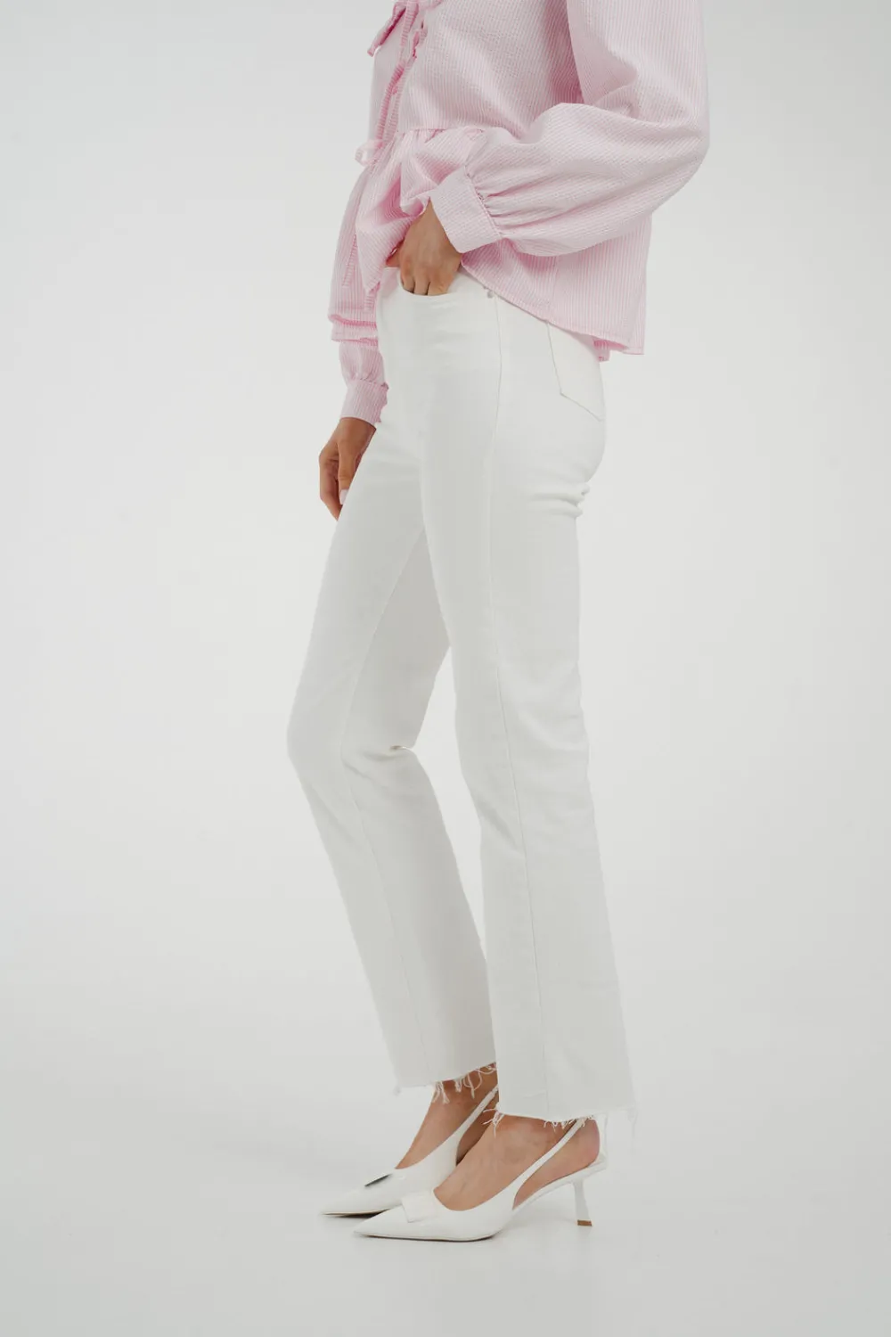The Lynne Straight Leg Jean In White is the perfect combination of style and comfort. Its high waist design flatters your figure, while the stretch fabric allows for easy movement. The classic straight leg cut is elevated by the crisp white colour and frayed hem, making these jeans a versatile and trendy addition to your wardrobe.