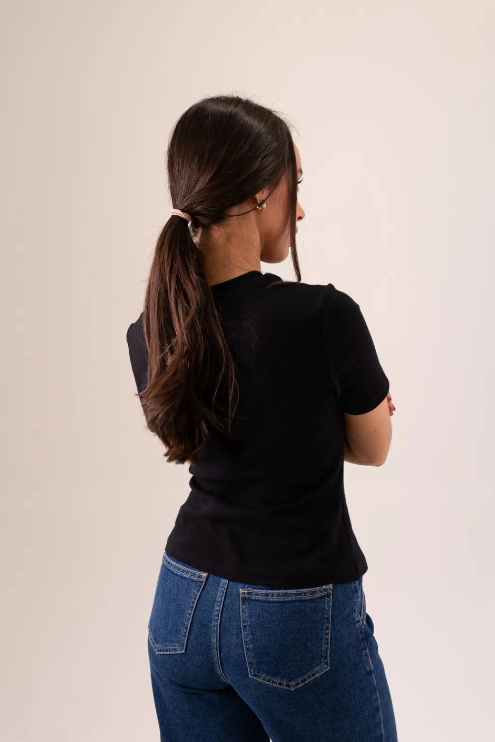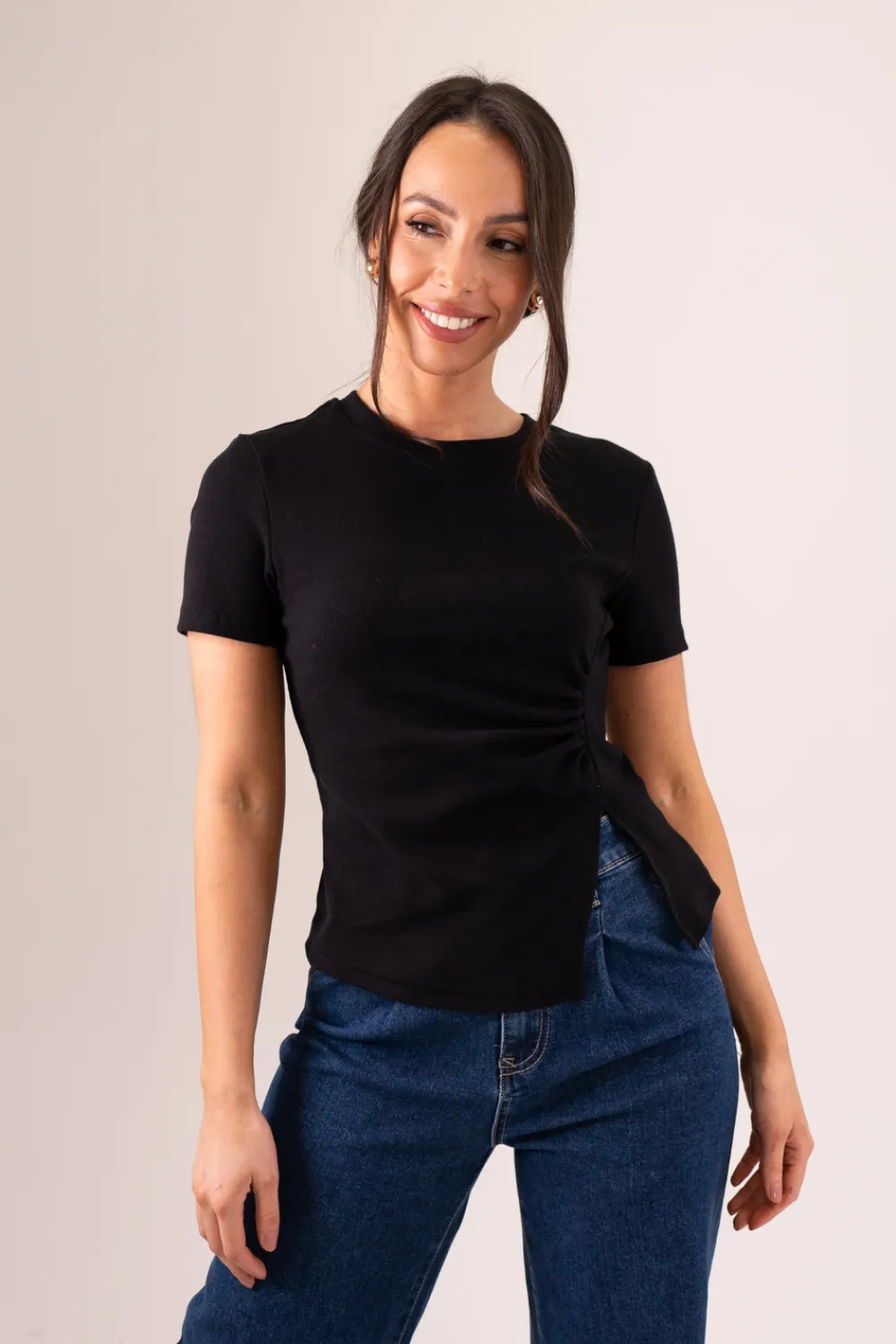 Expertly crafted with a round neck design and ruched front, the Elsa T-Shirt in black offers a sophisticated and versatile addition to your wardrobe. Made with comfortable cotton fabric, this shirt features a split hem detail for added style. Elevate your everyday look with this classic piece.