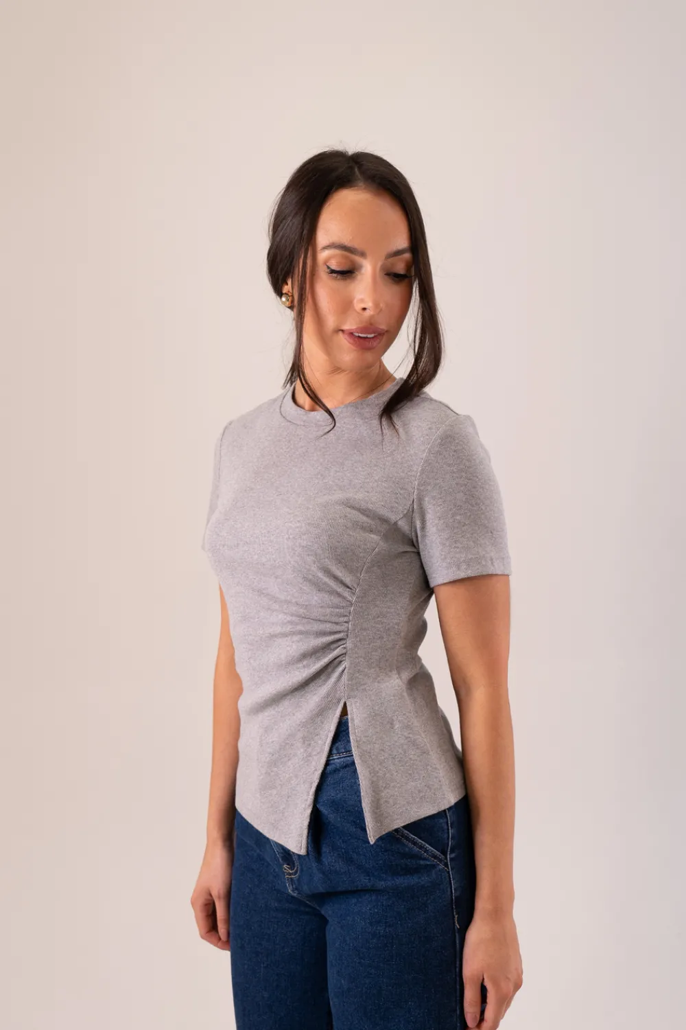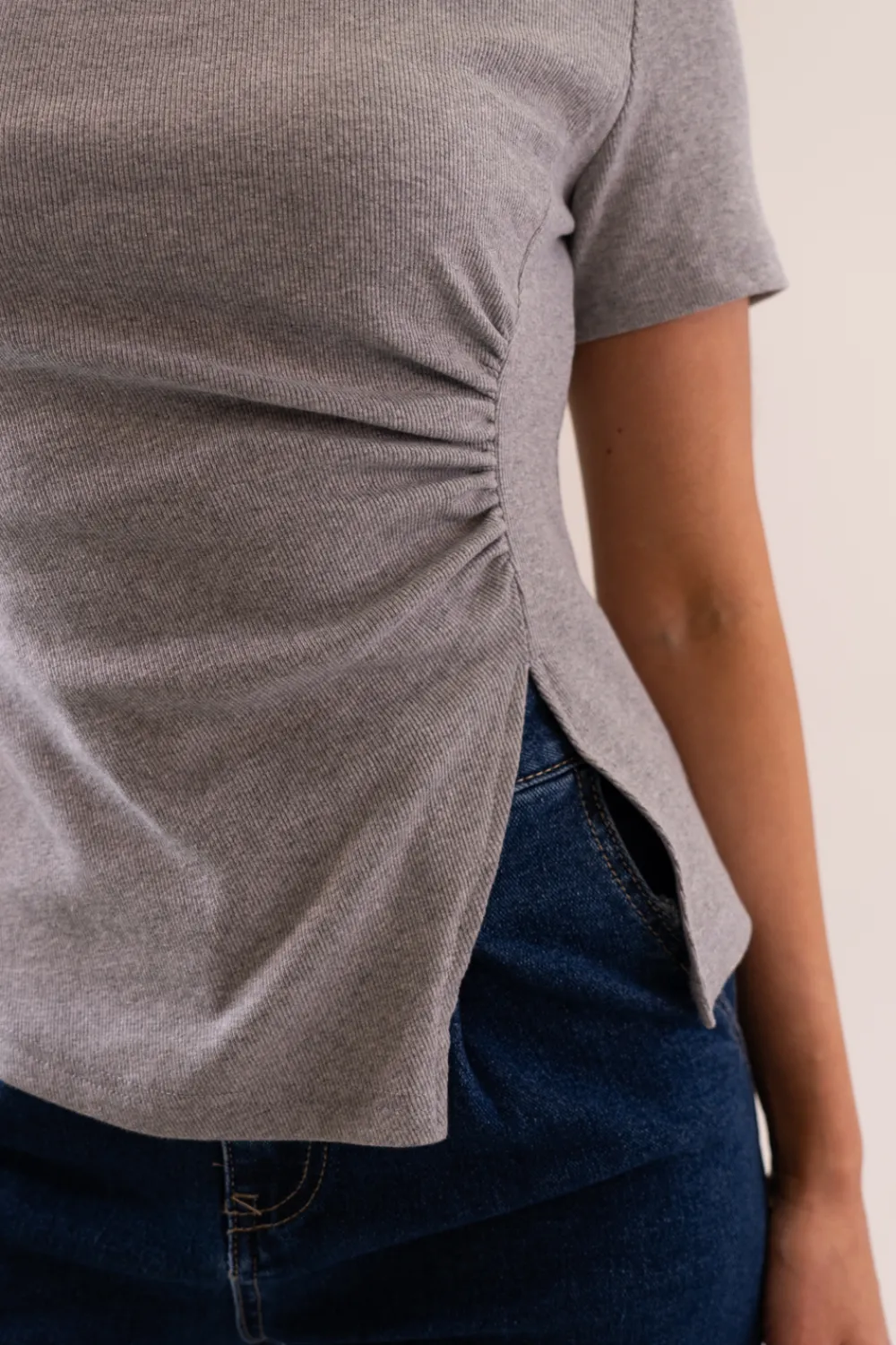 Elevate your casual look with our Elsa Ruched T-Shirt in Grey. Made from soft, breathable cotton, this shirt features a round neck, short sleeves, and a ruched front for added texture. The split hem detail adds a touch of style to this versatile piece. Perfect for everyday wear.