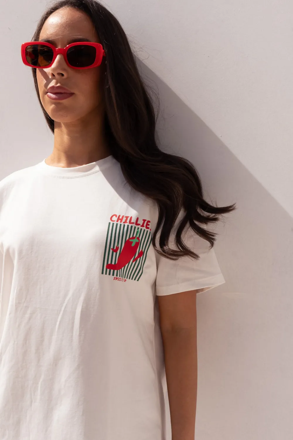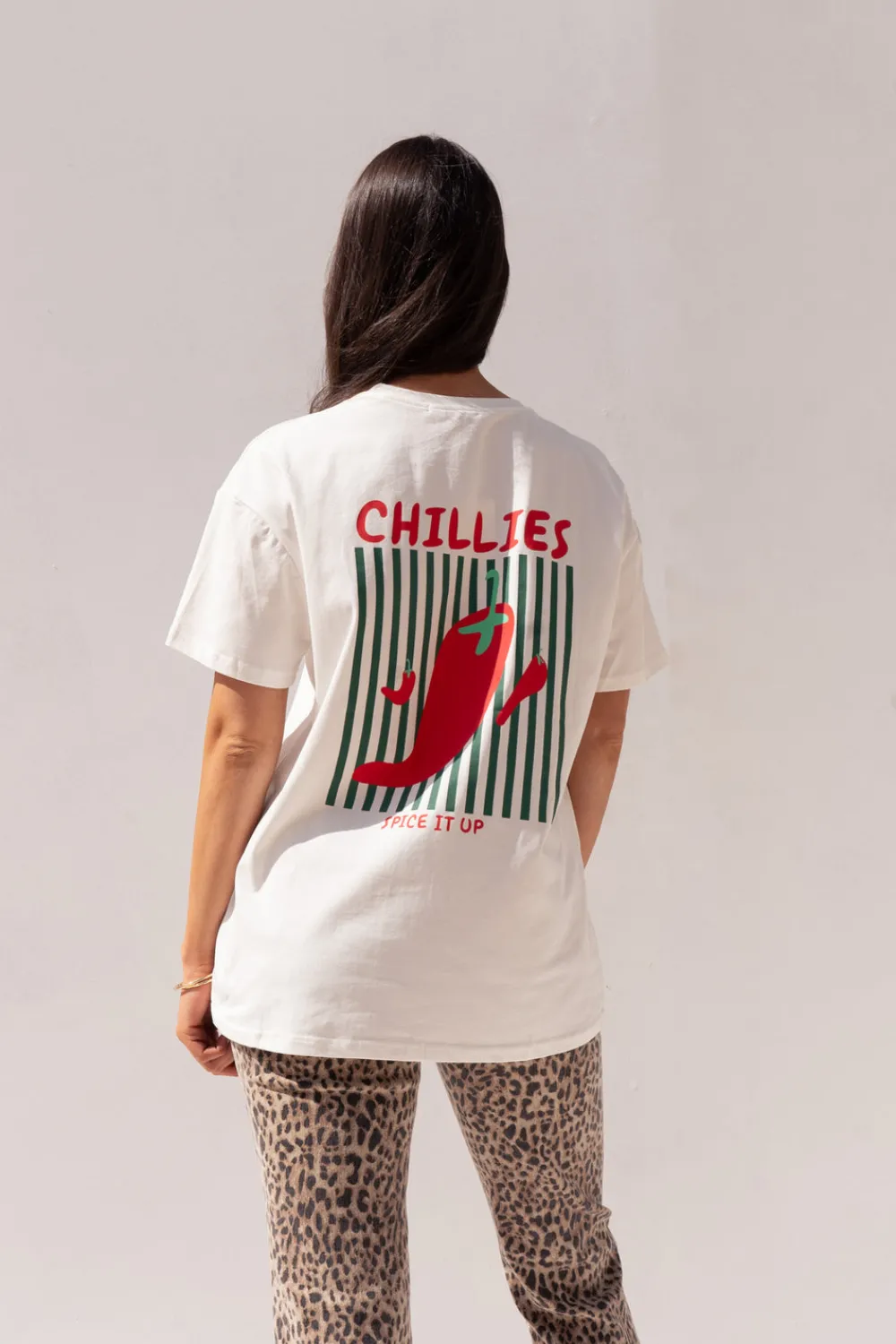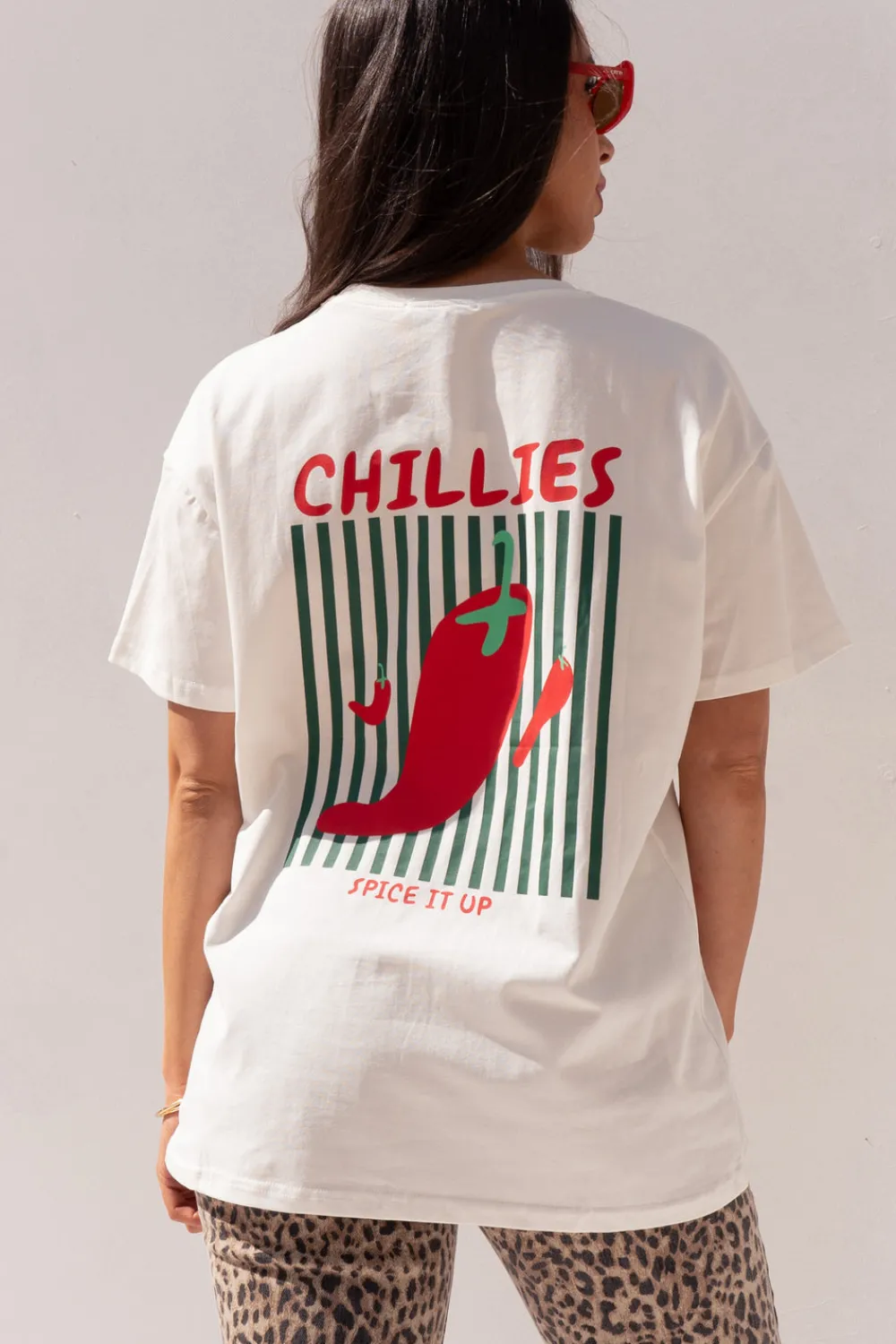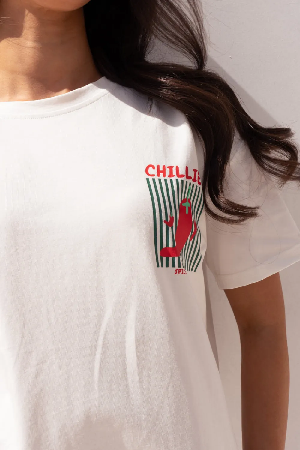This expertly crafted Melanie Chillies T-Shirt features a playful chillies graphic and slogan on a crisp white background. Made from a comfortable cotton mix with a classic round neck and short sleeves, this versatile piece offers a relaxed fit suitable for sizes 8-14. Perfect for casual styling with jeans or shorts for an effortlessly cool look.