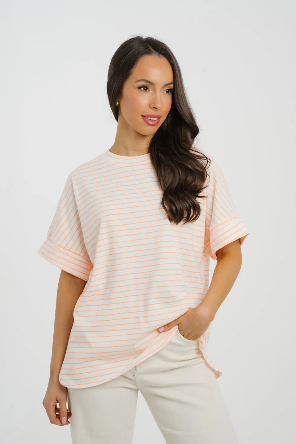 Upgrade your summer wardrobe with the Millie Margarita T-Shirt. Made of soft, breathable cotton, this round neck tee with short sleeves features a vibrant orange and white striped design. Complete with a fun Margarita graphic and slogan, it’s the perfect way to add a touch of playful style to any outfit.