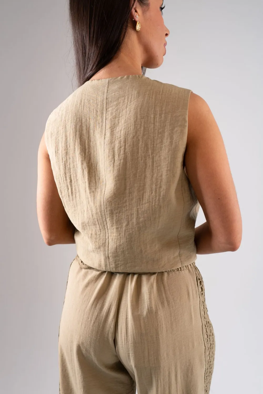 The Alana Cut Out Trim Waistcoat in Khaki is a stylish and versatile addition to any wardrobe. Its V-neck and sleeveless design provide a flattering and comfortable fit, while the button front adds a touch of sophistication. The cut out trim detail adds a unique touch to this classic khaki waistcoat. Complete the look with the matching trousers.
