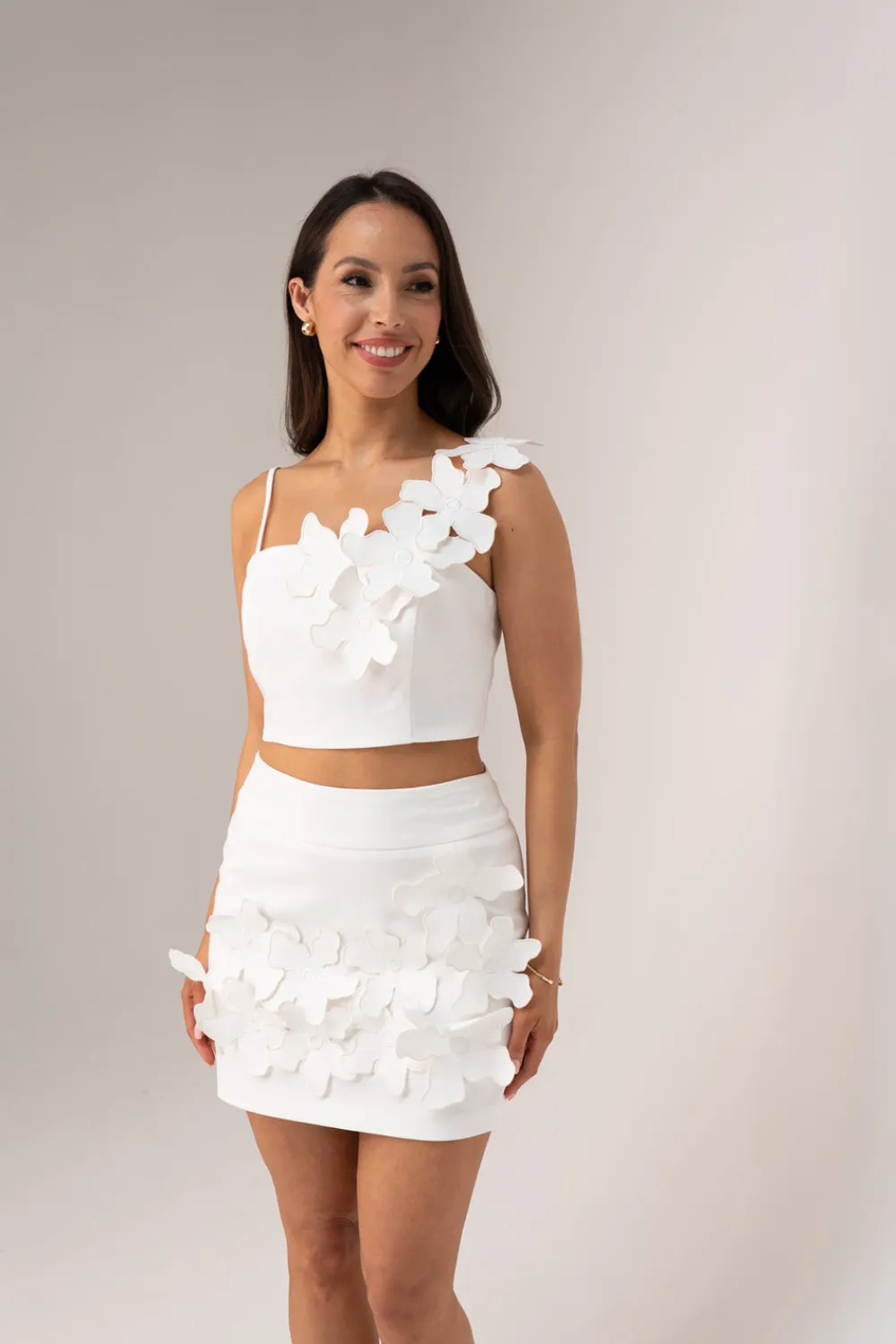 Elevate your ensemble with the Alana Floral Applique Top in Ivory. This sophisticated cropped piece features delicate floral applique detailing and fine, adjustable straps for a customised fit. The back zip closure ensures a sleek silhouette, while the lined construction provides comfort and structure. Crafted with a slight stretch for ease of movement, this versatile top can be paired with its matching skirt for a coordinated look or styled separately for endless outfit possibilities.