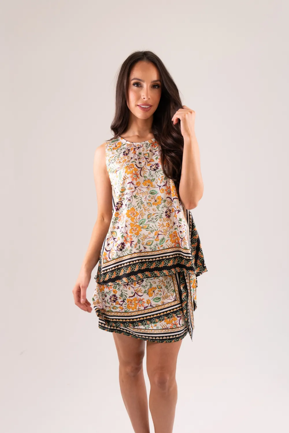 Effortlessly chic, the Becca Sleeveless Floral Top in Orange Mix features a vibrant floral print and an asymmetric design for a touch of modern edge. The tie back adds a feminine touch, while the matching skirt allows for versatile styling options. Stay stylish and comfortable in this must-have top.