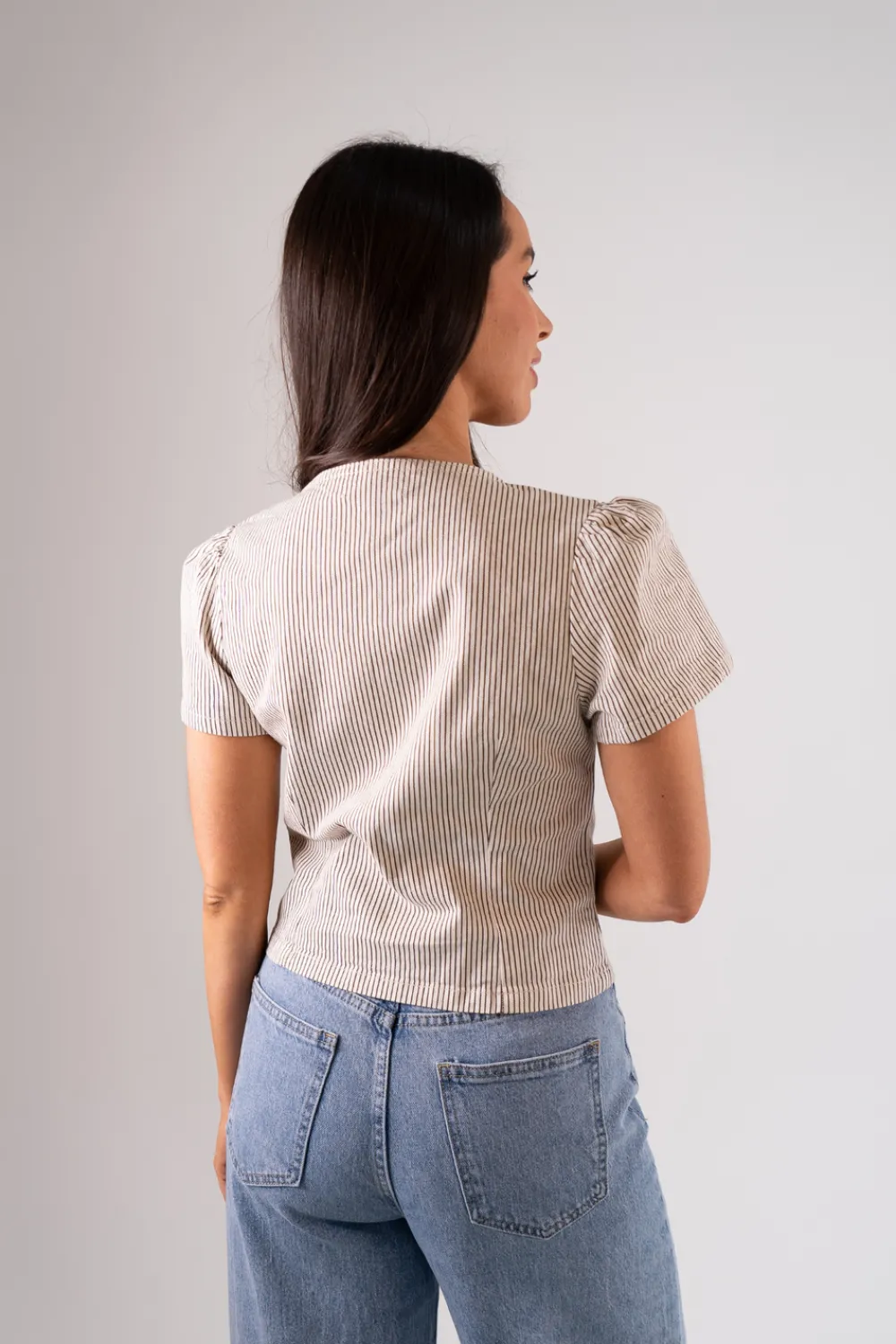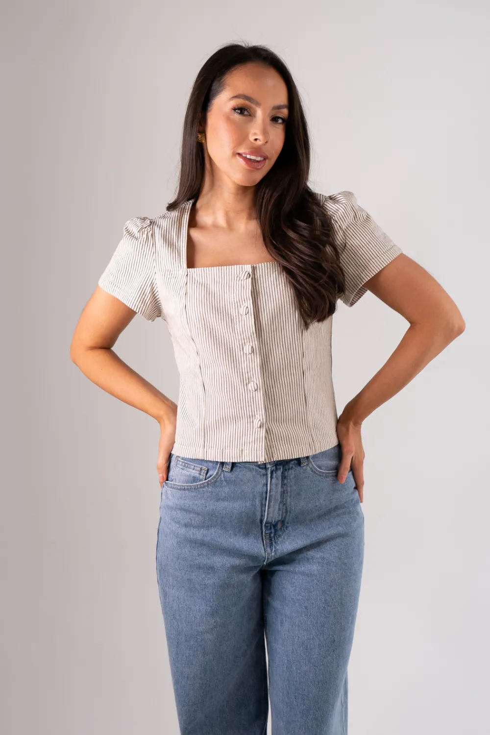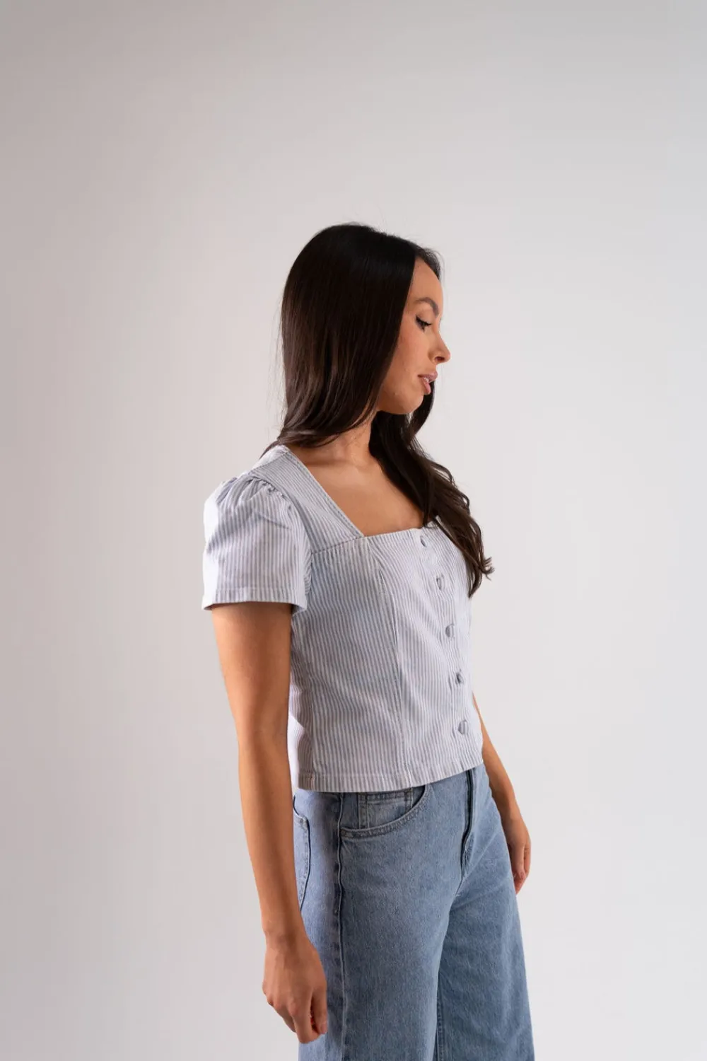 The Cindy Stripe Square Neck Top In Blue offers a timeless, sophisticated style with its square neck and button front design. Made with a comfortable cotton mix and featuring a classic blue stripe, this short sleeve top is perfect for any occasion. Upgrade your wardrobe with this versatile and chic piece.