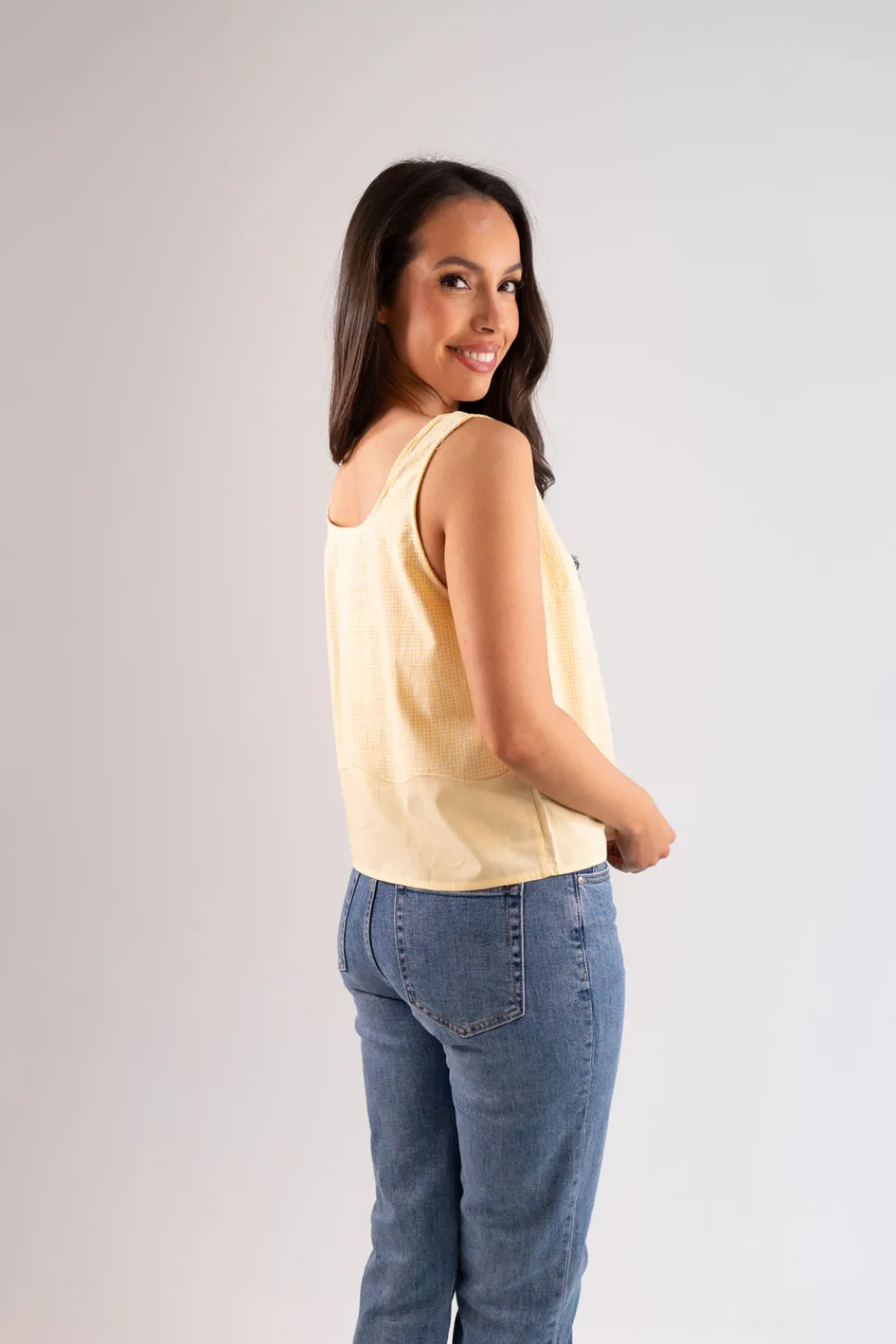 Expertly crafted with a square neck, broad straps, and fine gingham pattern, the Connie Contrast Hem Gingham Top In Lemon is sure to elevate your wardrobe. Made with high-quality cotton and featuring a delicate broderie anglaise contrast hem, this top exudes both style and comfort.
