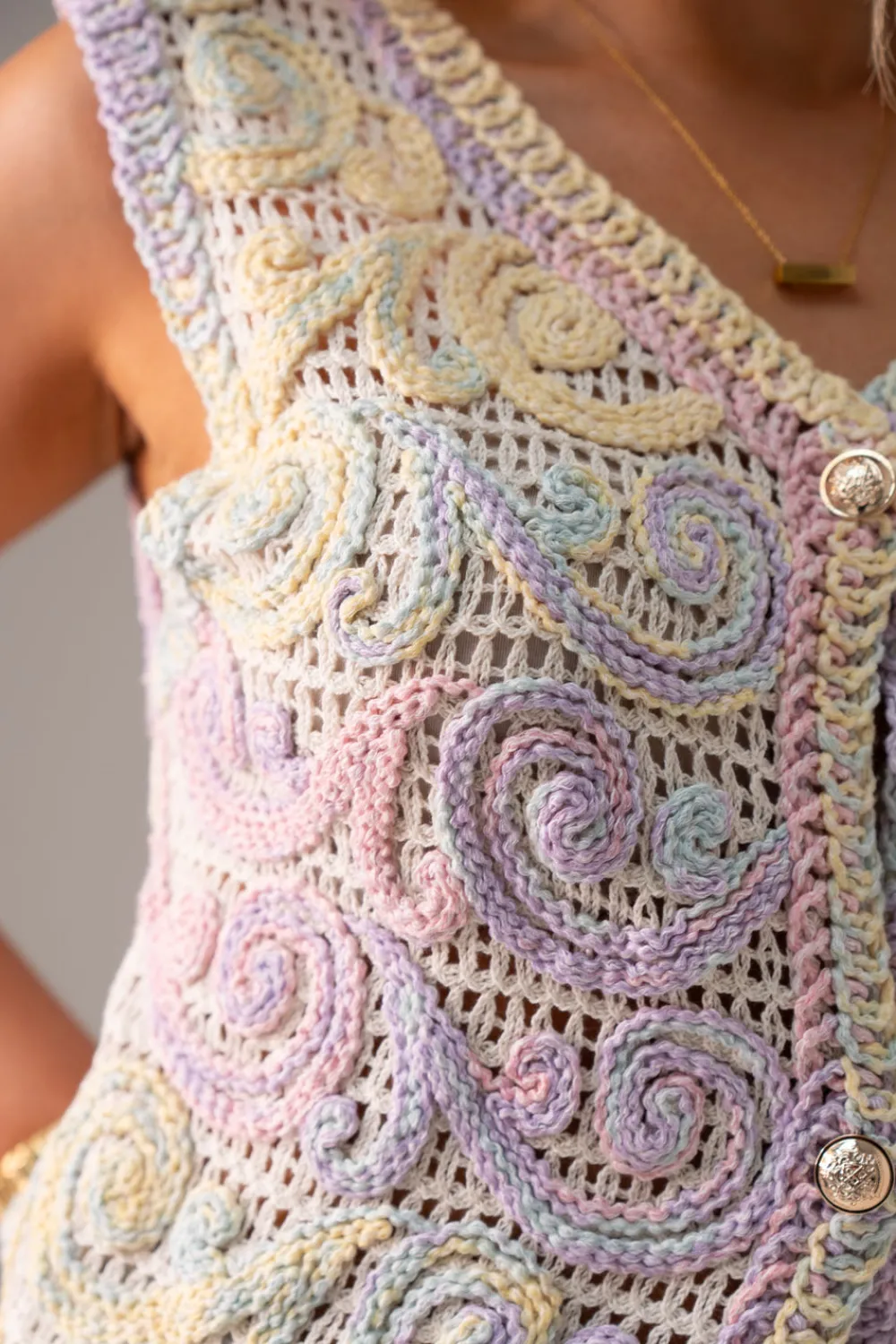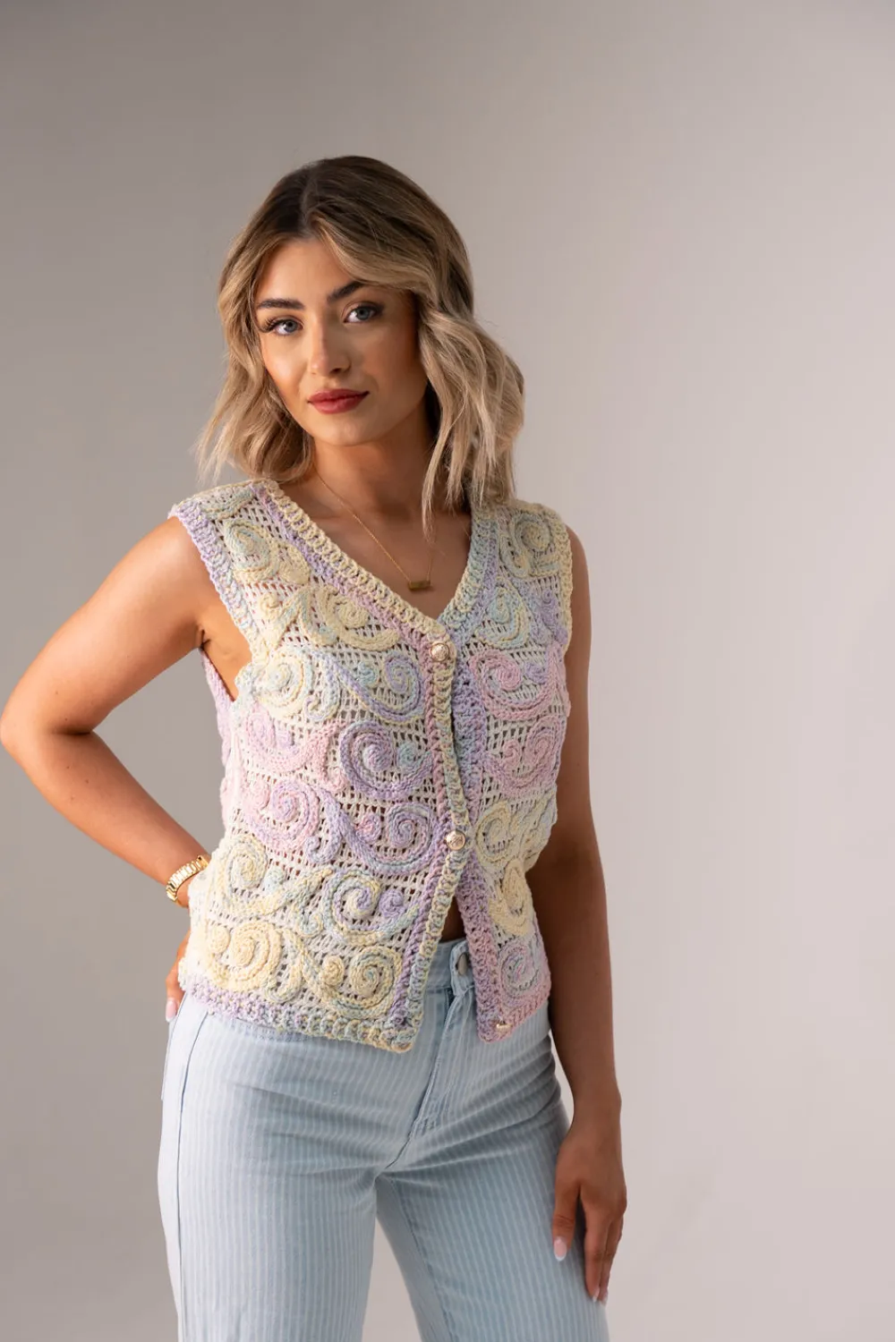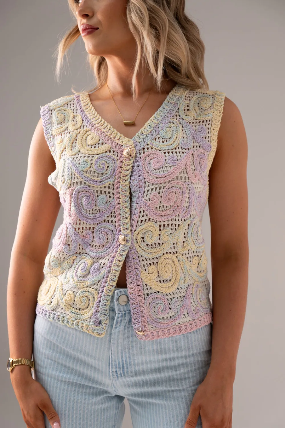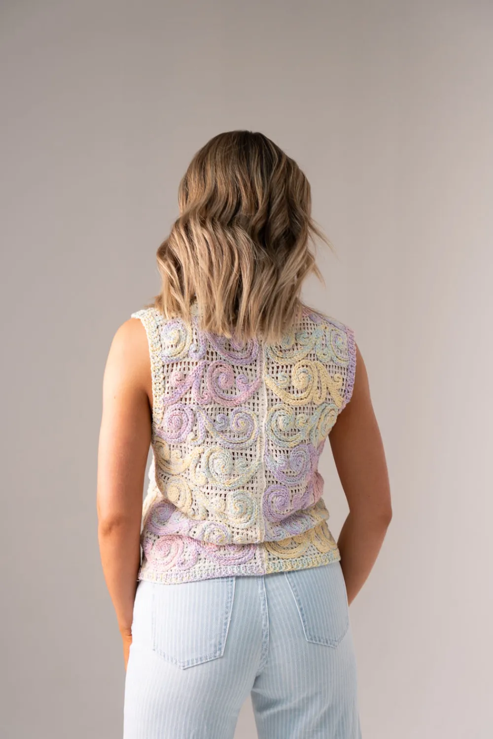 This versatile crochet waistcoat features a flattering V-neck design with convenient button front closure. Crafted from quality cotton in vibrant multicolour patterns, the Ella waistcoat offers a flexible one-size fit suitable for UK sizes 8-14. The intricate crochet detailing adds texture and visual interest to any outfit.