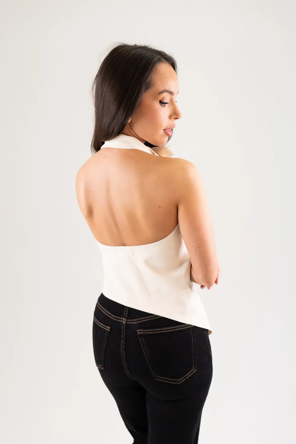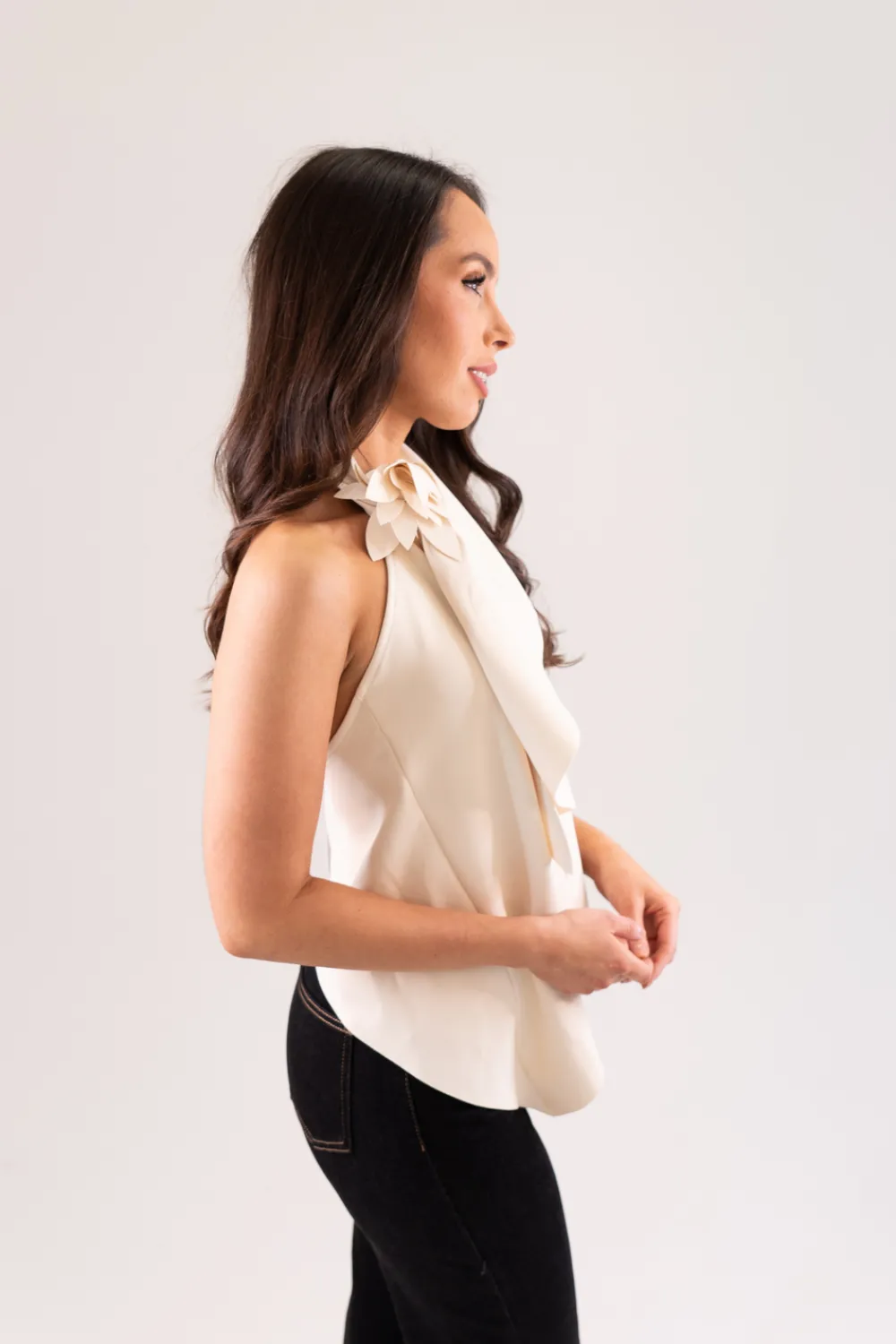 This top features an elegant high neck and a beautiful floral drape detail, making it perfect for any occasion. The sleeveless design adds a touch of sophistication, while the off-white colour complements any outfit. Elevate your wardrobe with this versatile and stylish top.