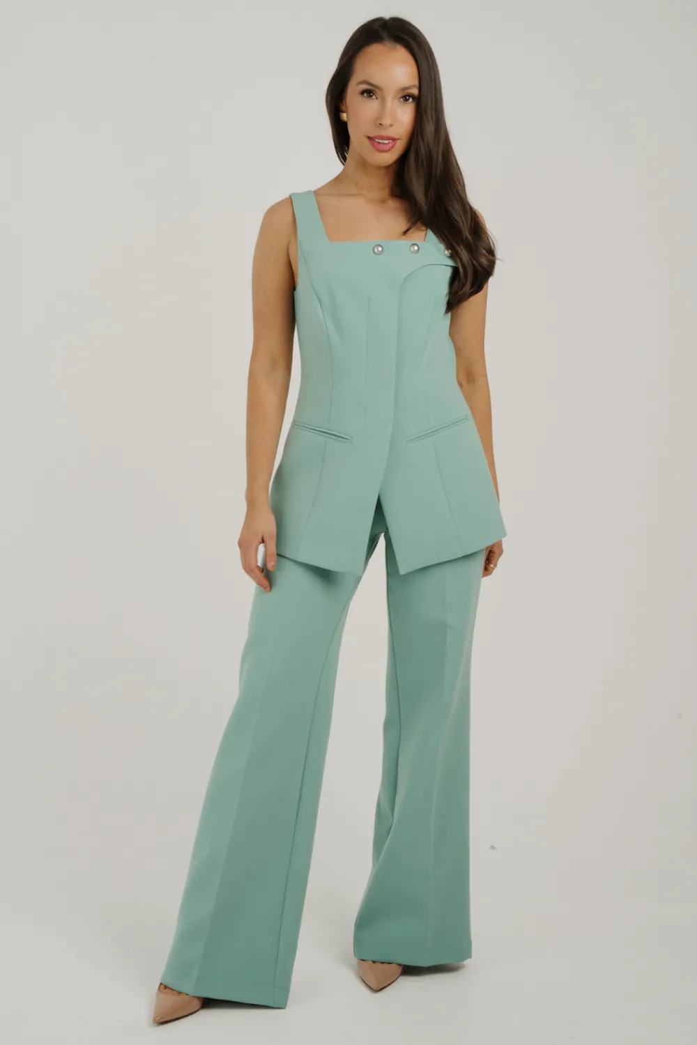 This sage green waistcoat features a square neck and sleeveless design for a stylish and comfortable fit. The asymmetric button detail and split front add unique, modern touches. Pair with matching trousers for a complete and sophisticated look.