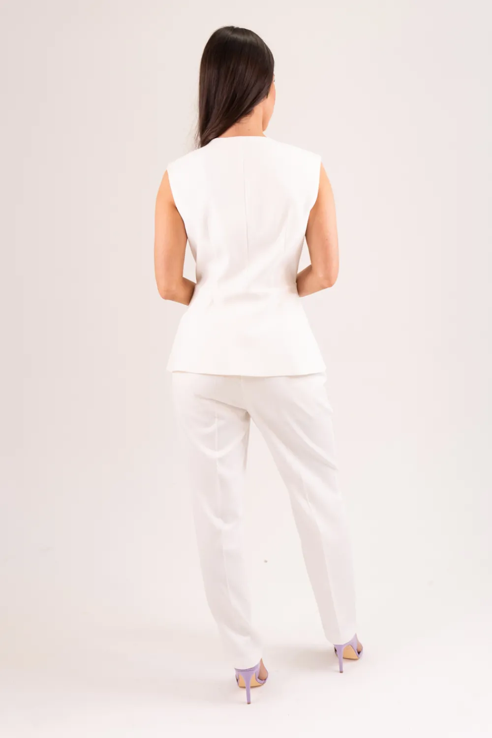 The Kayla Split Front Waistcoat In Cream is a versatile and stylish addition to any wardrobe. With a flattering V-neck and split hem design, this waistcoat is perfect for layering over any outfit. The gold button front adds a touch of elegance, while the cut out detail adds a unique touch. Complete the look with our matching cream trousers for a coordinated ensemble.