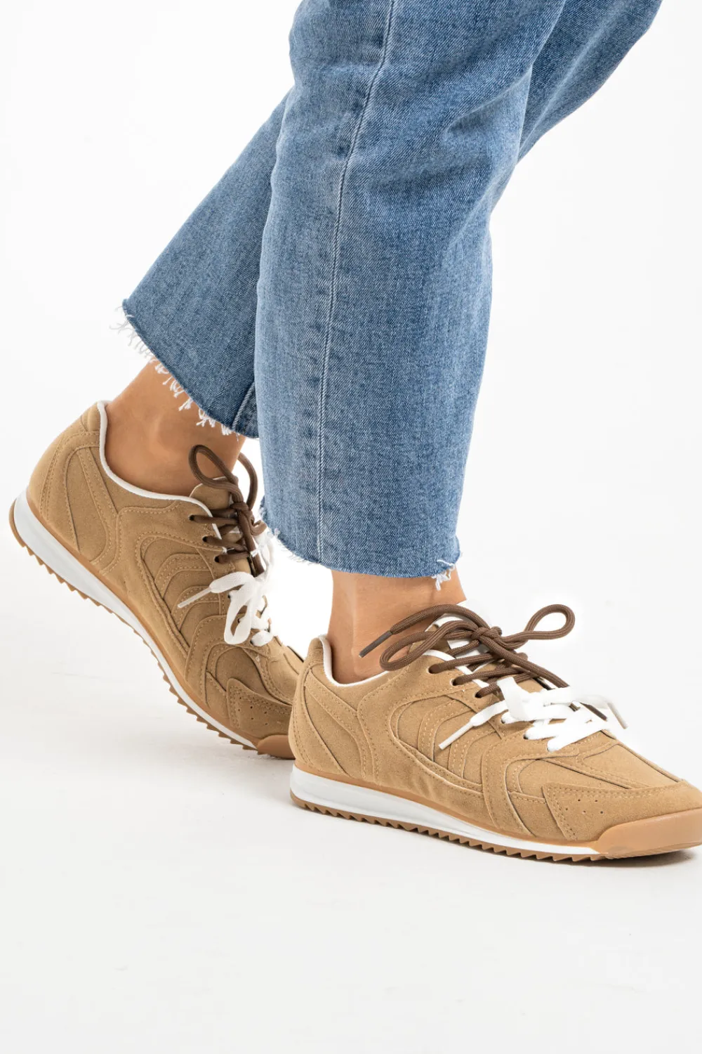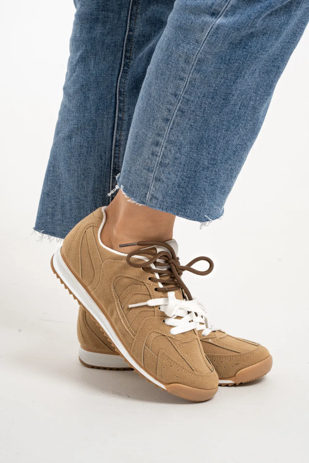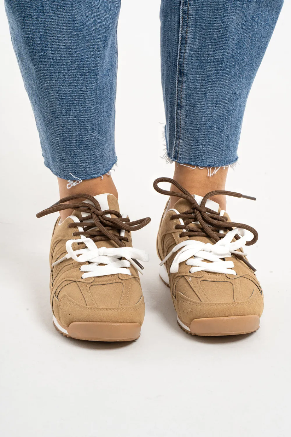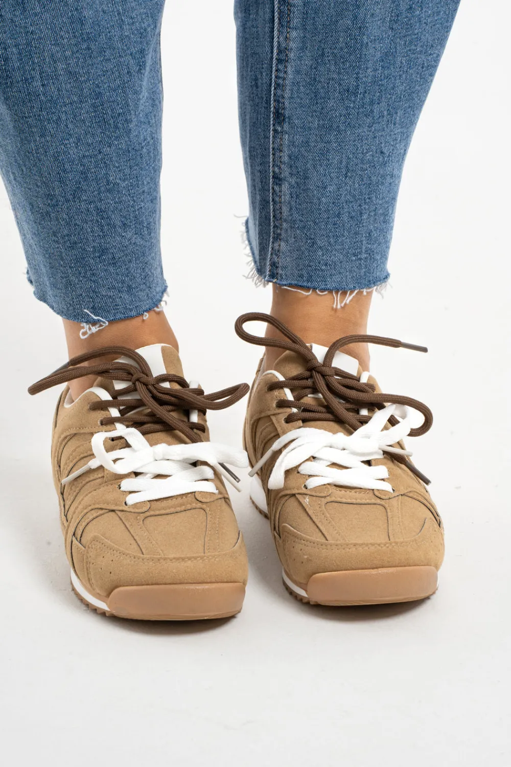 Expertly crafted with faux suede, these Cathy Double Laced Trainers offer both style and comfort. With a rounded toe and ridged sole, these camel trainers provide a sturdy grip and true-to-size fit. The contrast of brown and white double laces adds a touch of chic to the overall design.