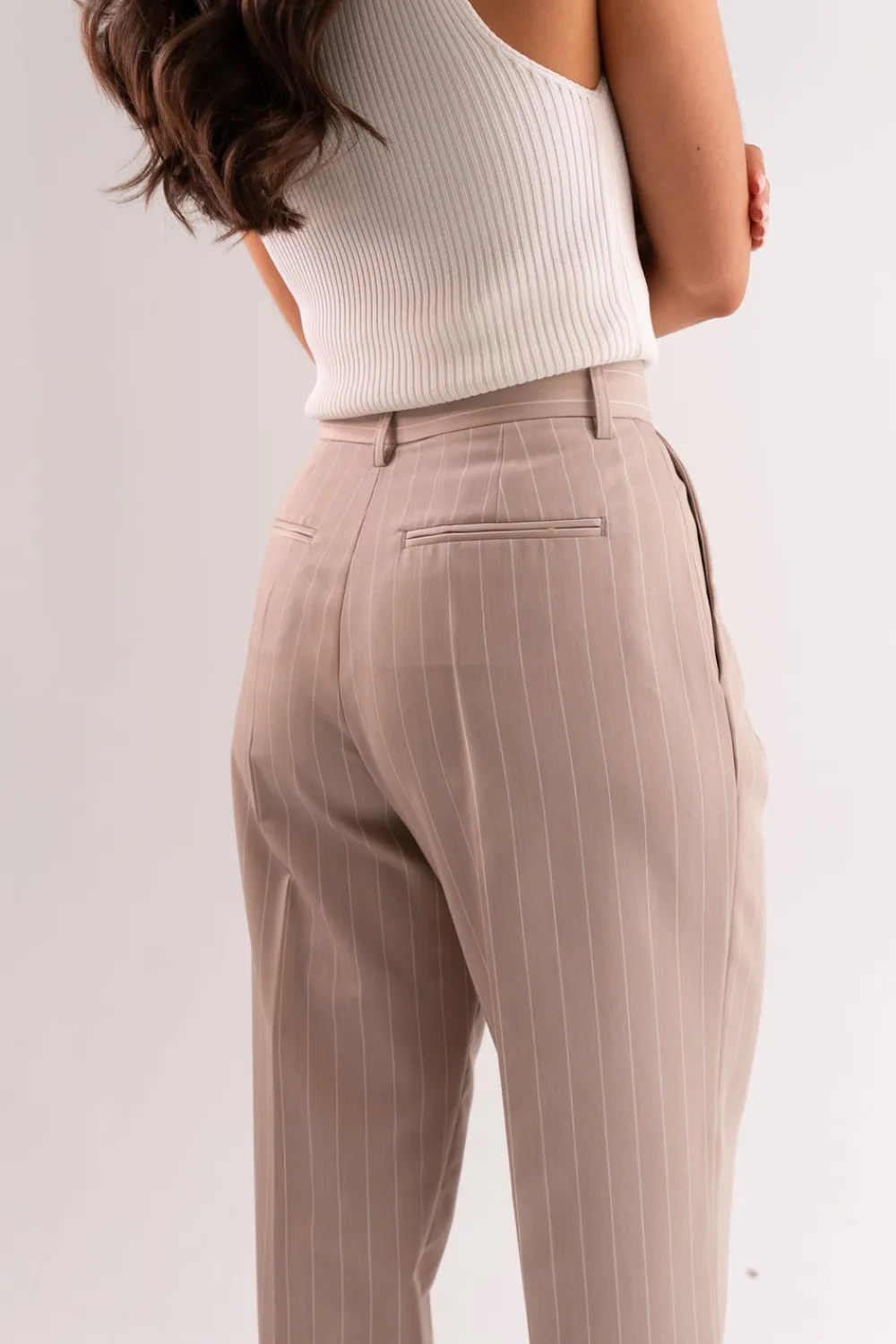 Expertly crafted for a professional look, the Faye Pinstripe Trousers in Sand are a must-have for any wardrobe. The neutral, sand colour is versatile and complements the cream pinstripe design. With a high waist, button front, and straight leg, these trousers also feature pockets for convenience. Complete the set with the matching blazer.