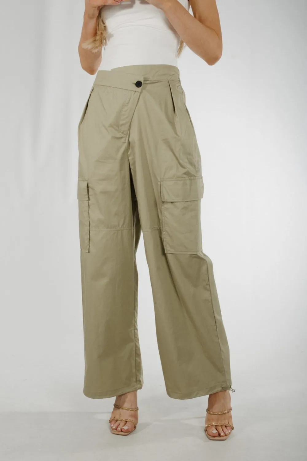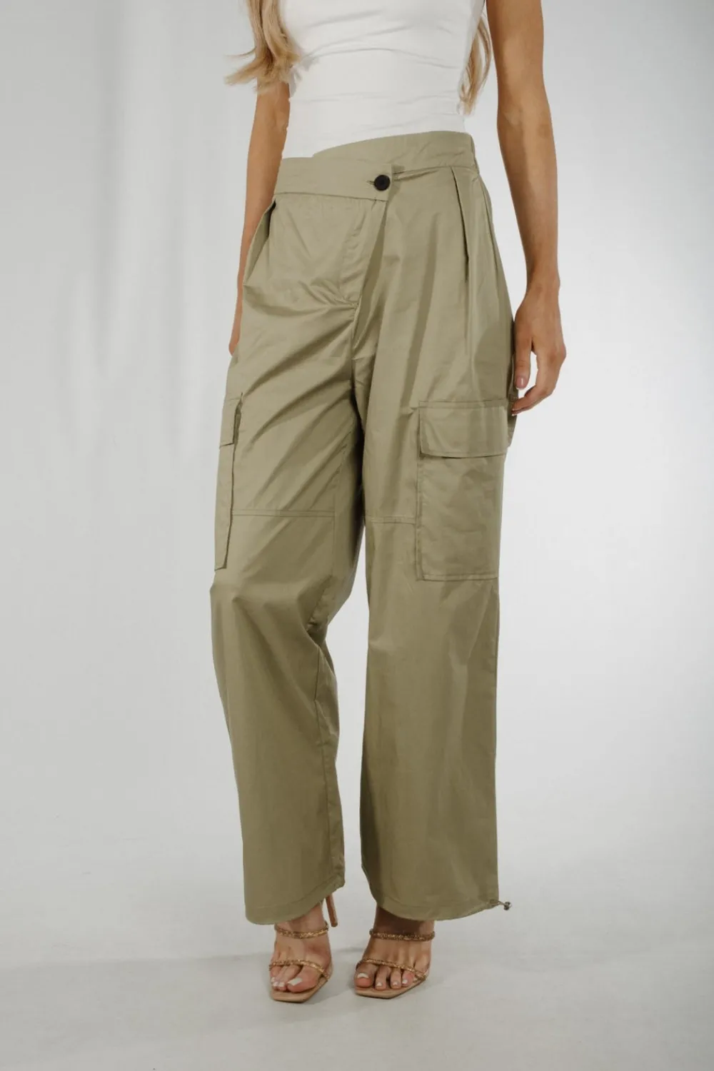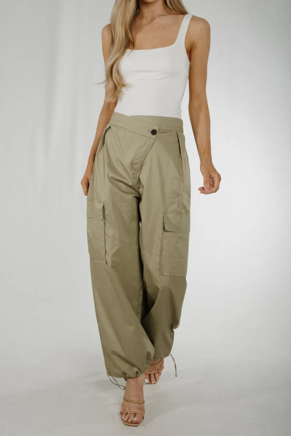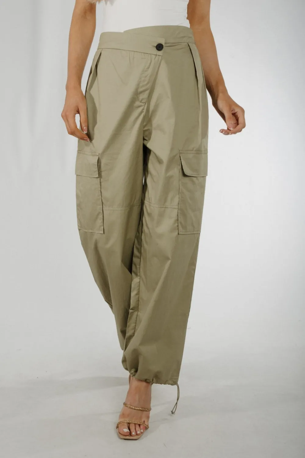 Elasticated Waist Asymmetric Button Detail Khaki Drawstring Cuff Detail Cargo Style Pockets …
