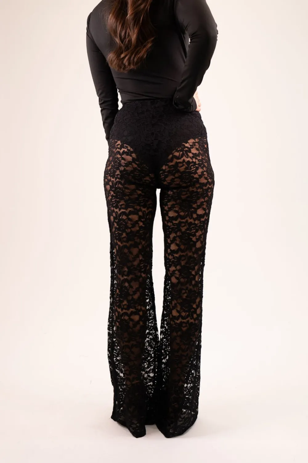 Expertly crafted, the Kate Lace Trousers in Black combine a high waist and flared leg design for a flattering silhouette. The black lace material adds a touch of elegance, while the sheer fabric adds a modern twist. Elevate your wardrobe with these versatile trousers that will effortlessly take you from day to night.