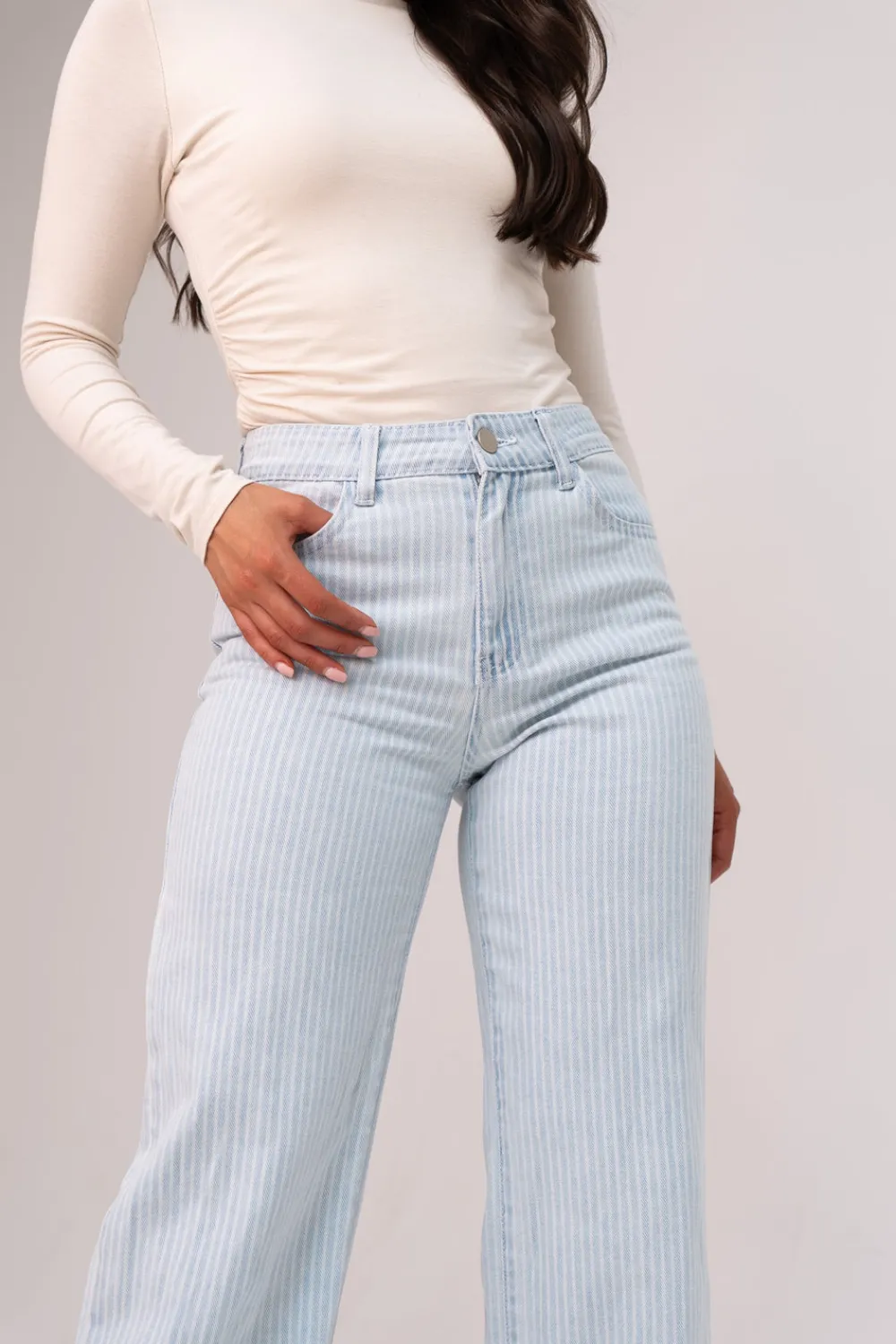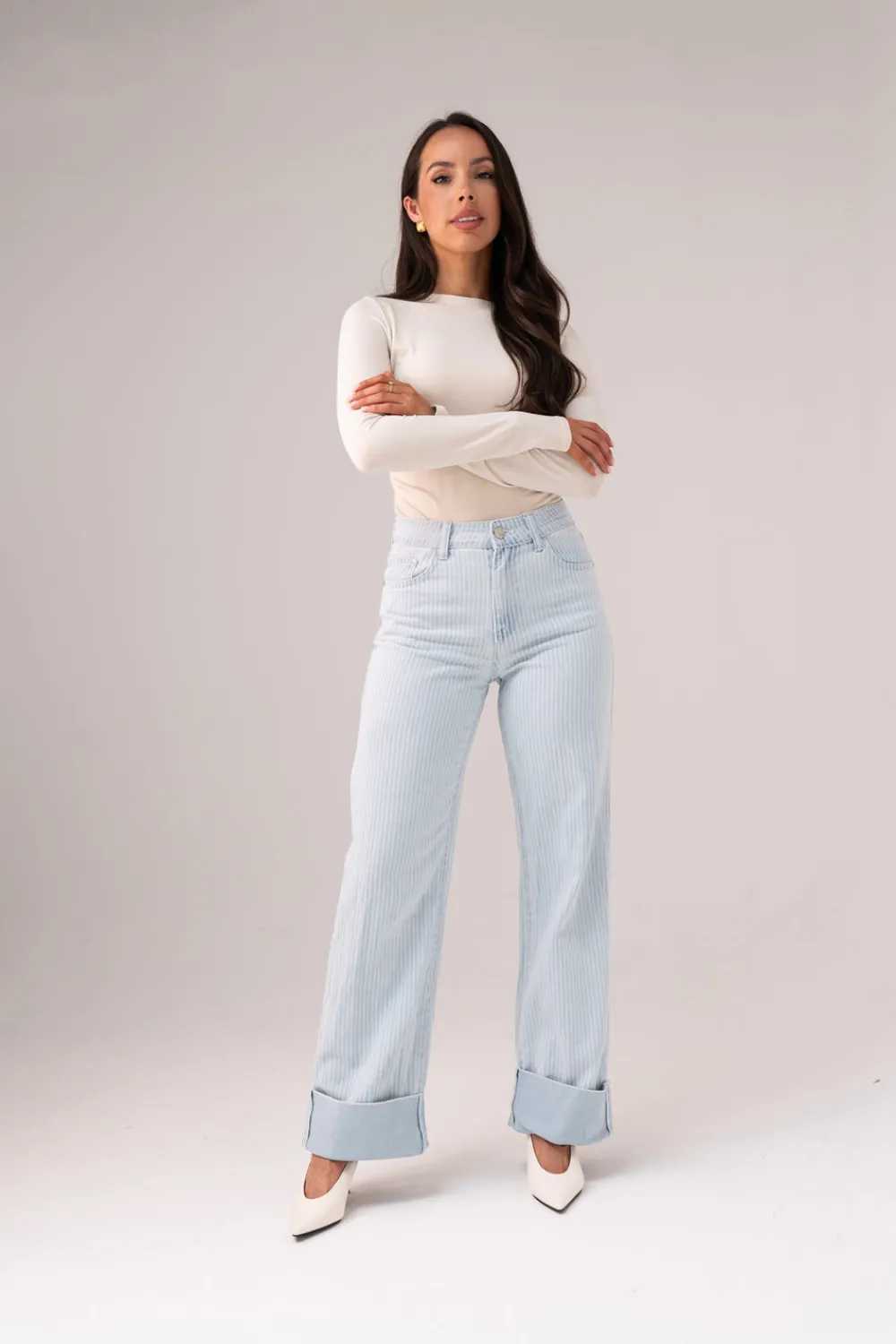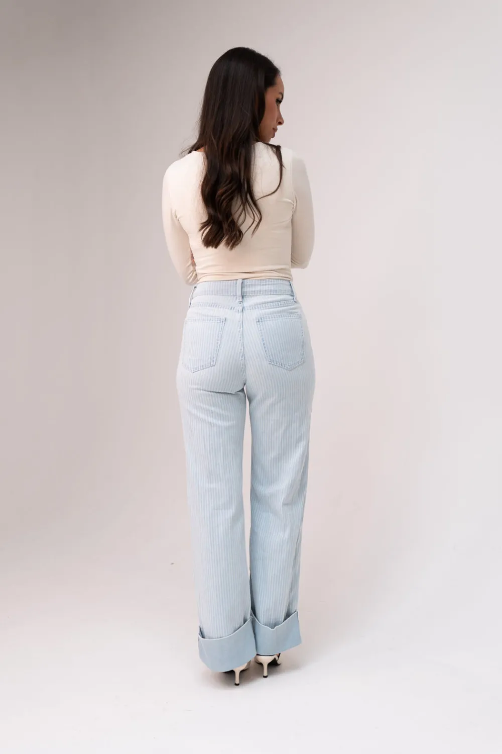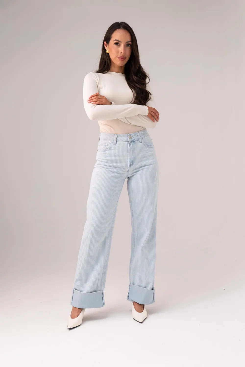Expertly crafted for comfort and style, our Love Laura Summer Turn Up In Pinstripe feature a high waist and lightweight cotton fabric. The light wash and pinstripe design add a touch of sophistication, while the turn up hem and zip & button waist provide a perfect fit. Elevate your summer wardrobe.