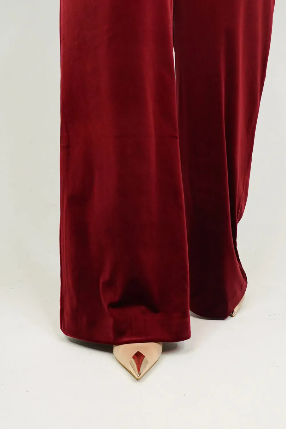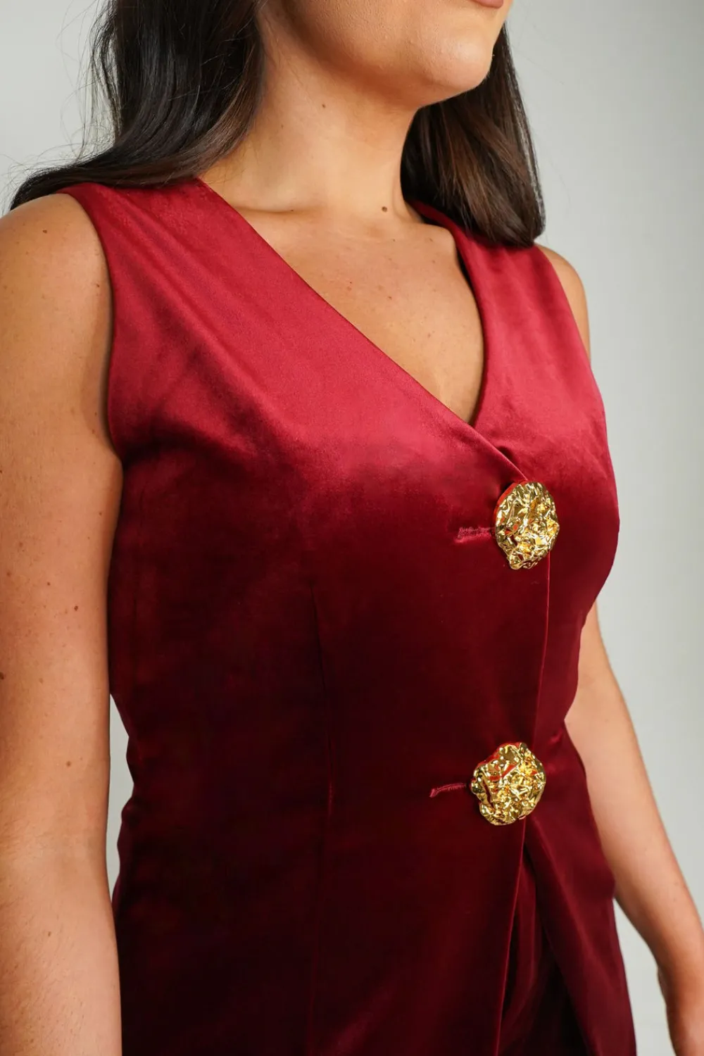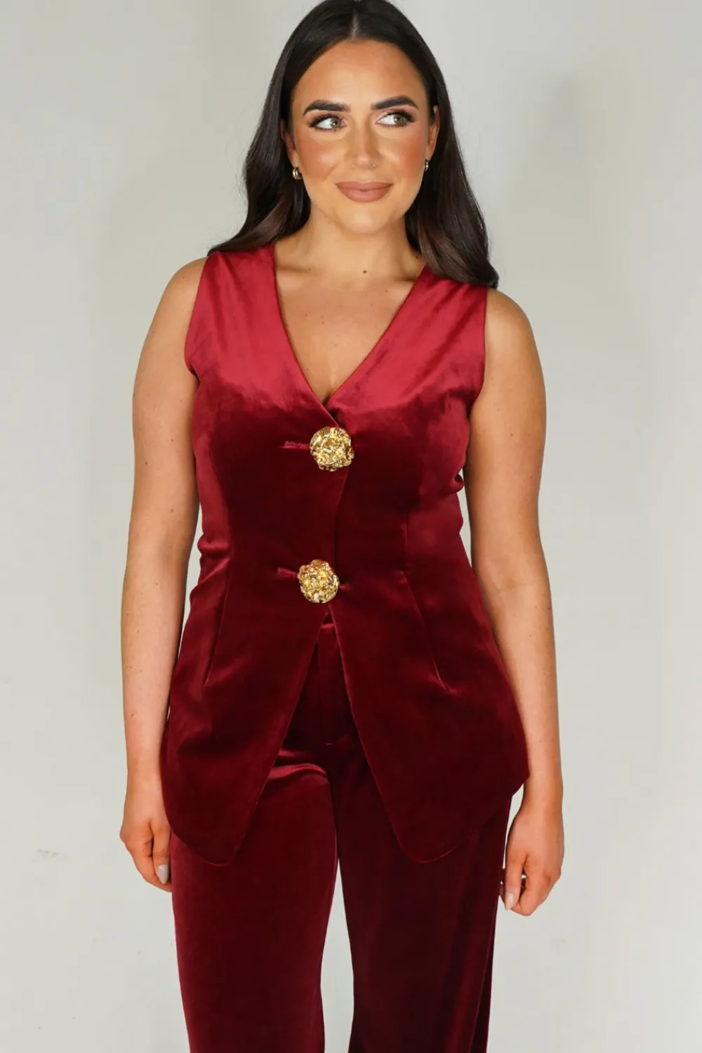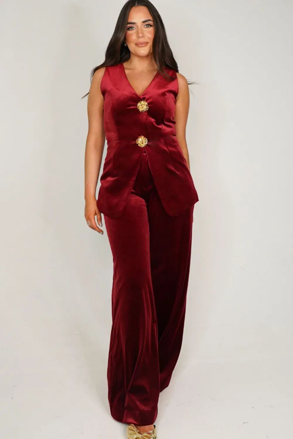 The Love Laura Velvet Two Piece in Mulled Wine is a luxurious ensemble, featuring a rich wine red velvet fabric. The set includes a waistcoat with a longer length, gold button front and a pair of lined trousers with pockets. The waistcoat measures 70cm shoulder to hem, while the trousers have a 120cm waist to hem and a 90cm inside leg. A spare button is also included. Elevate your formal wardrobe with this elegant and stylish two piece.